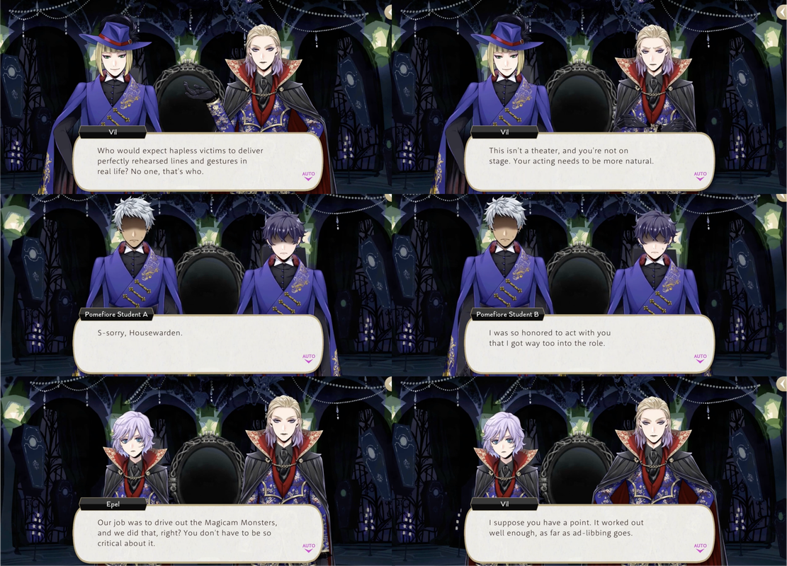 (Epel: “Our job was to drive out the Magicam Monsters, and we did that, right? You don’t have to be so critical about it.” – Vil: “I suppose you have a point. It worked out well enough, as far as ad-libbing goes.”)