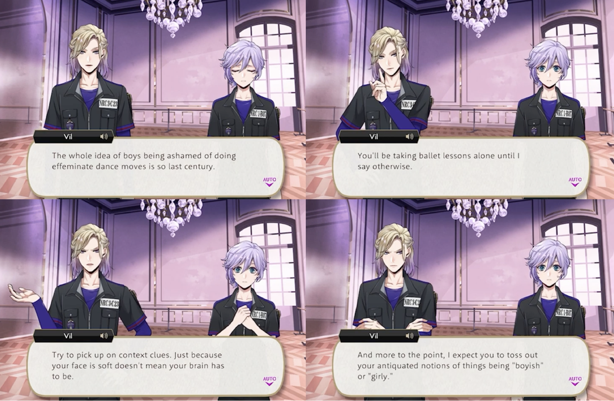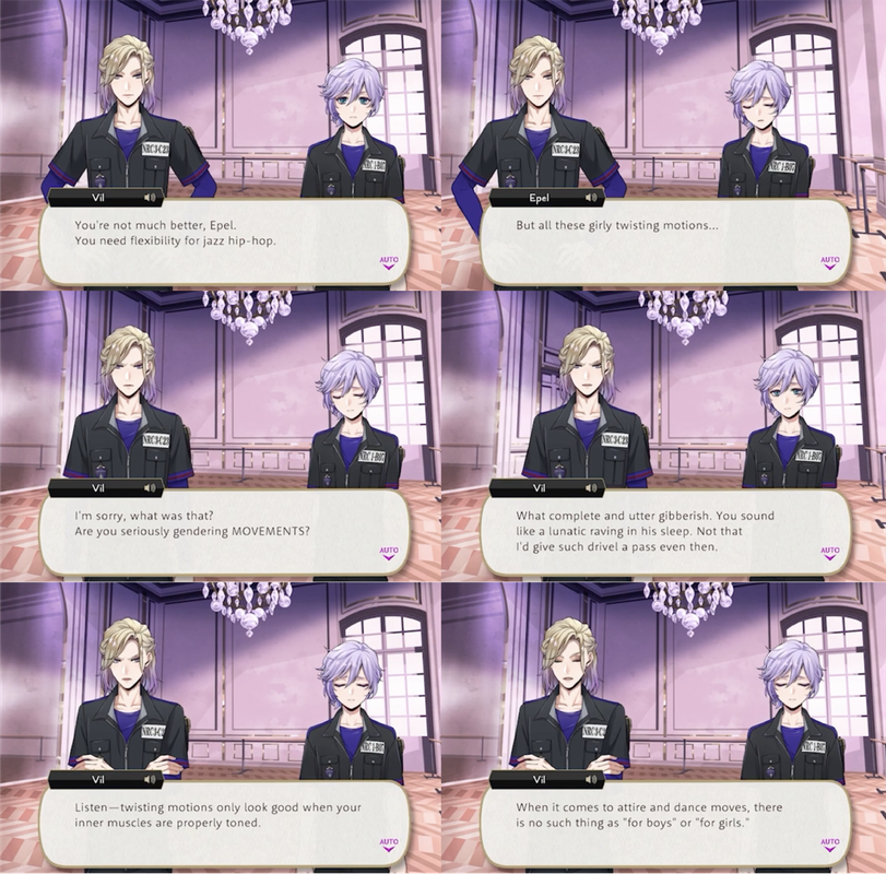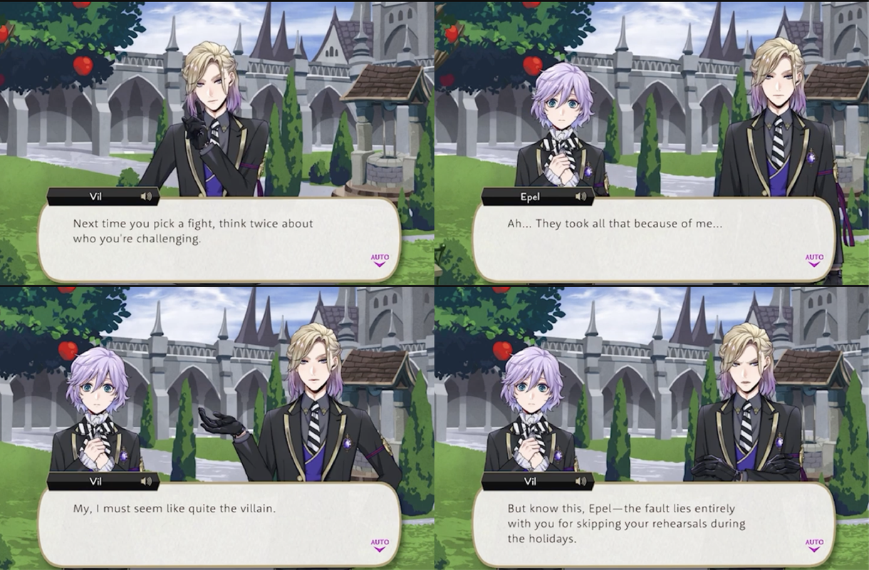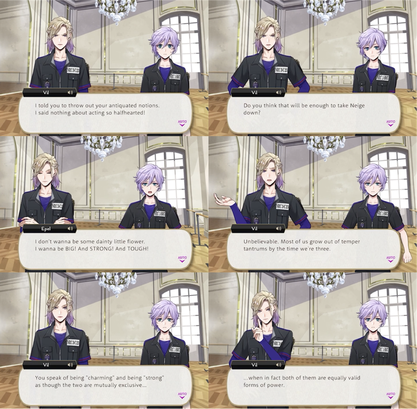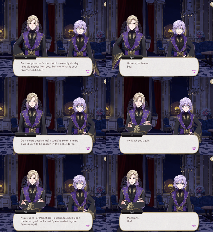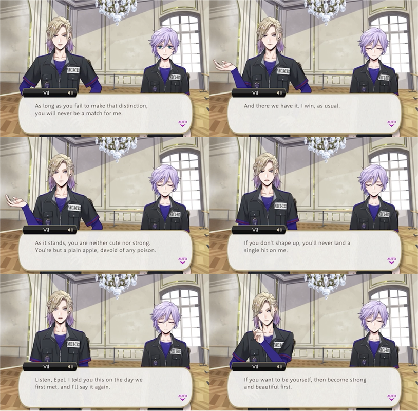 Vil’s first interaction with Epel involves Epel insulting Vil (apropos of nothing, from Vil’s perspective) by calling him girly and weak on his first day as Pomefiore housewarden.
