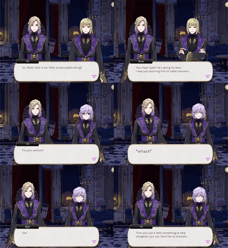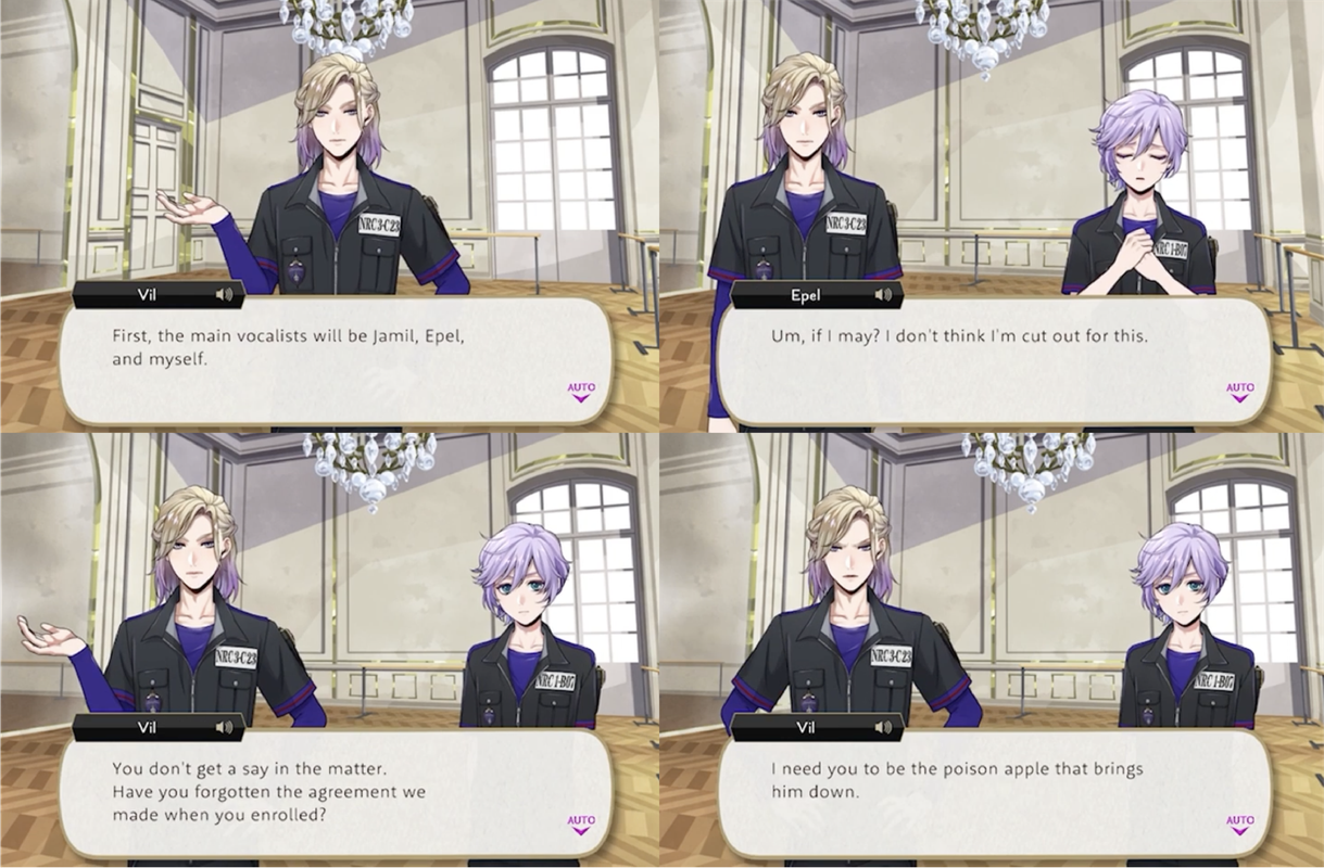 We see Vil correct Epel’s table manners, make Epel say that his favorite food is macarons, correct his speech patterns and beat Ace, Deuce and Grim in a fight when they attempt to stand up for Epel. During Book 5 Vil insists on transforming Epel into “the poison apple that brings (Neige) down”, but Epel is reluctant to perform “girly twisting motions”.