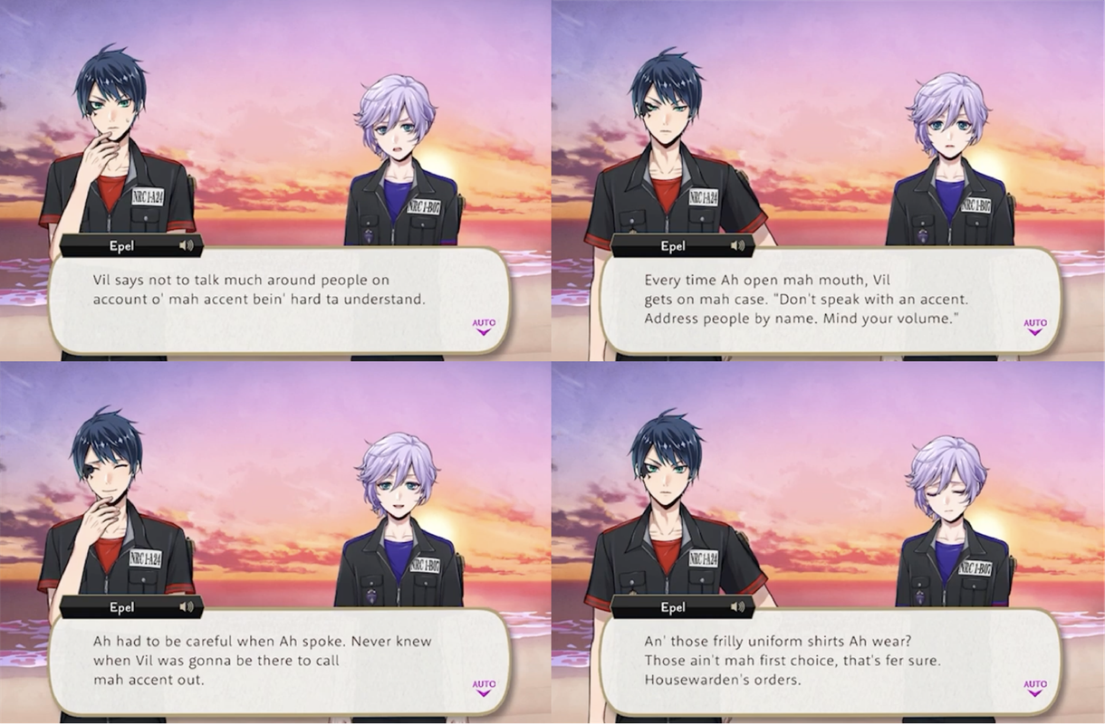 Epel runs away from rehearsals and explains how Vil forces him to wear the frilly shirt worn with his school uniform and has forbade him from speaking in his natural dialect, and when Grim comments on Epel speaking differently during White Rabbit Fes Epel responds, “Please don’t tell Vil!” When Idia reacts with surprise to hearing Epel’s usual way of speaking in his dream Ortho explains that Epel actually tends to act like that most of the time when he is around the other first-year students.