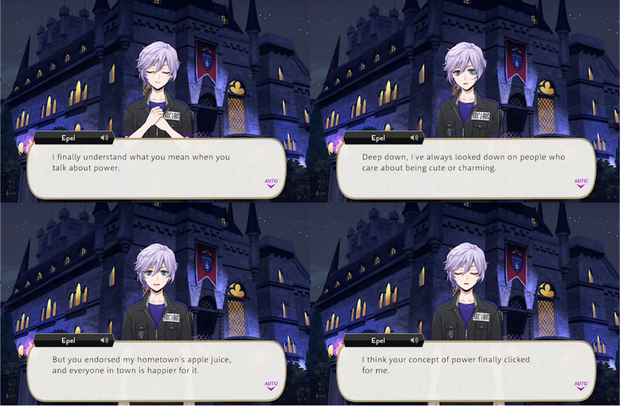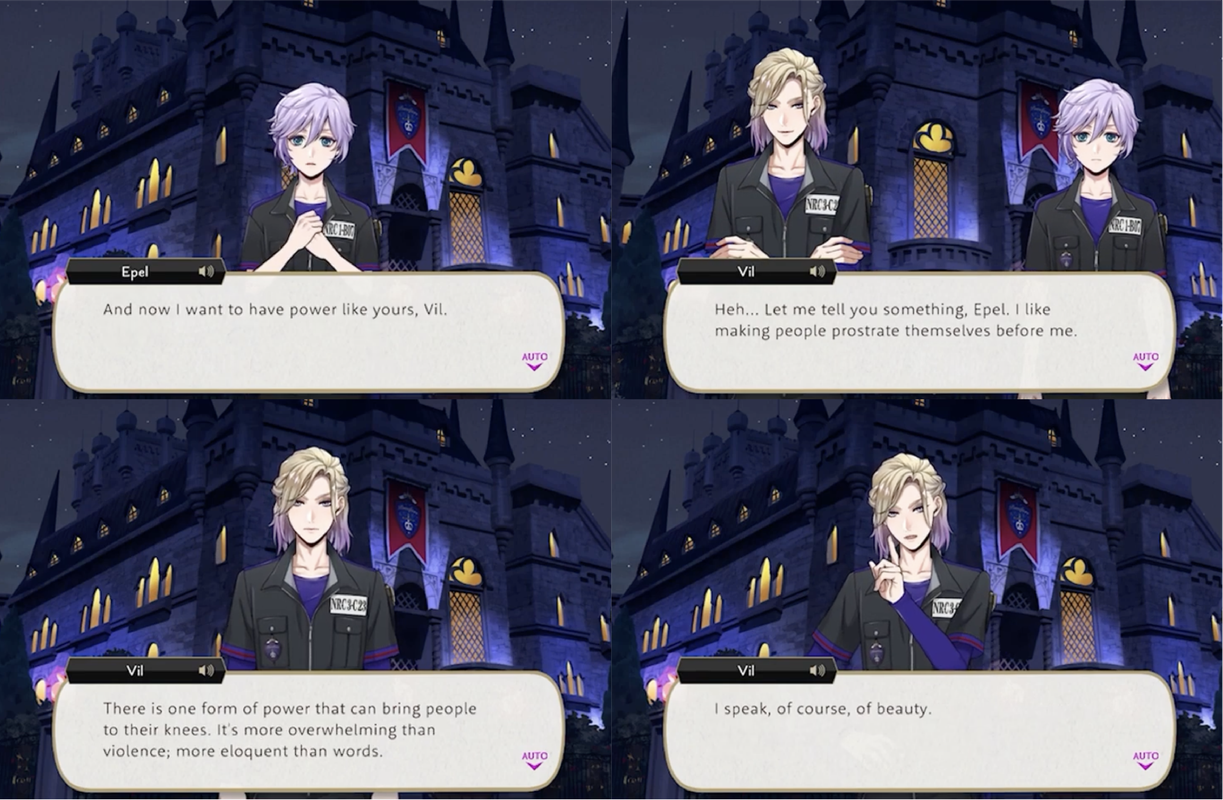 Epel returns to the school and tells Vil that while “Deep down, (he’s) always looked down on people who care about being cute or charming”, he finally understands what Vil meant when he talked about power. Vil responds, “There is one form of power that can bring people to their knees. It is more overwhelming than violence, more eloquent than word. I speak, of course, of beauty…You were fortunate enough to be born with the weapon called ‘charm’. Whether you sharpen that weapon into something useful or let it rust away is up to you.”