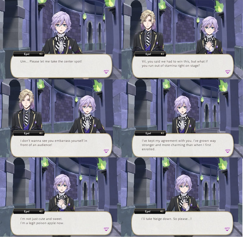 By the end of Book 5 Epel is asking Vil to allow him to take center stage in the performance he never wanted to participate in in the first place, saying that he is “a legit poison apple now” and he wants to take Neige down, not see Vil embarrass himself in front of an audience by performing post-overblot and running out of stamina mid-show.