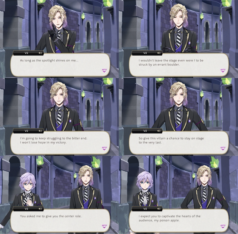 Vil refuses Epel’s offer, saying that he stills expects Epel “to captivate the hearts of the audience,” but, “As long as the spotlight shines on me, I wouldn’t leave the stage even were I to be struck by an errant boulder. I’m going to keep struggling to the bitter end. I won’t lose hope in my victory. So give this villain a chance to stay on stage to the very last.”