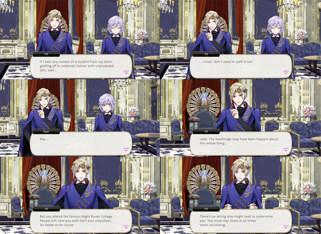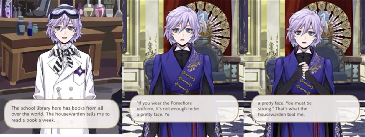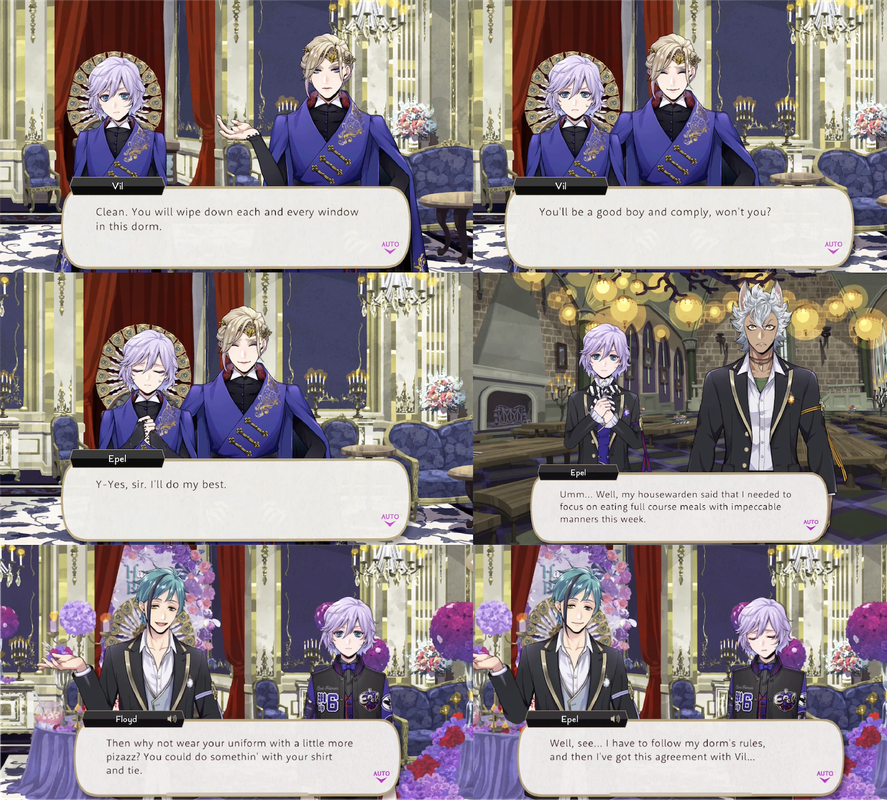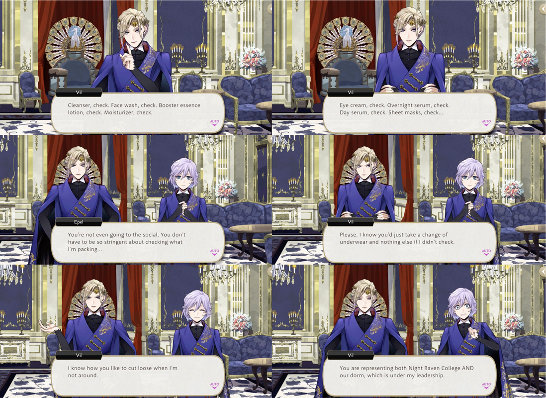 Despite not attending the social at Noble Bell College himself Vil is stringent about checking what it is that Epel packs, saying, “I know you’d just take a change of underwear and nothing else if I didn’t check. I know how you like to cut loose when I’m not around,” and says that he had best not hear any rumors of a student from Pomefiore “goofing off” in Fleur City “in unkempt clothes with unprotected skin.”
