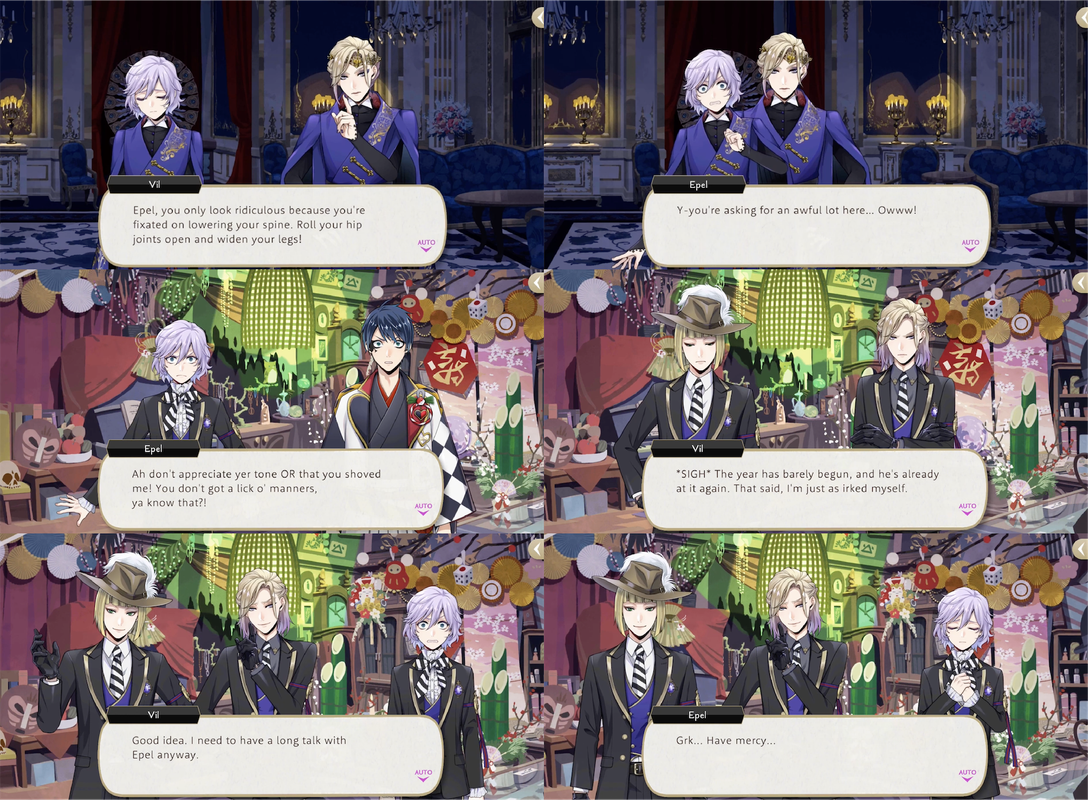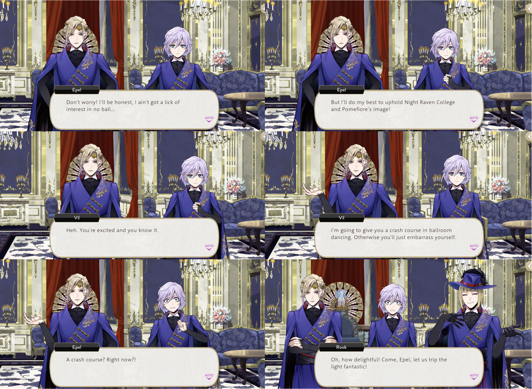 Vil warns Epel to stay sharp at all times when socializing, as people will be viewing them with their own prejudices for better or for worse, and there is no telling who might seek to undermine them. Vil then gives Epel a crash course in ballroom dancing.