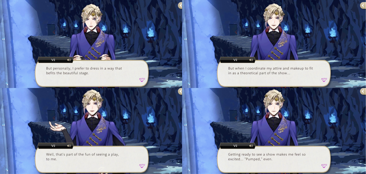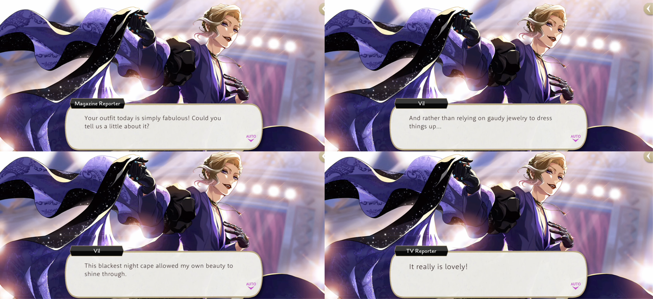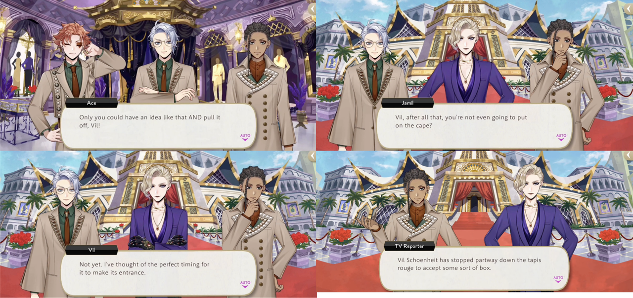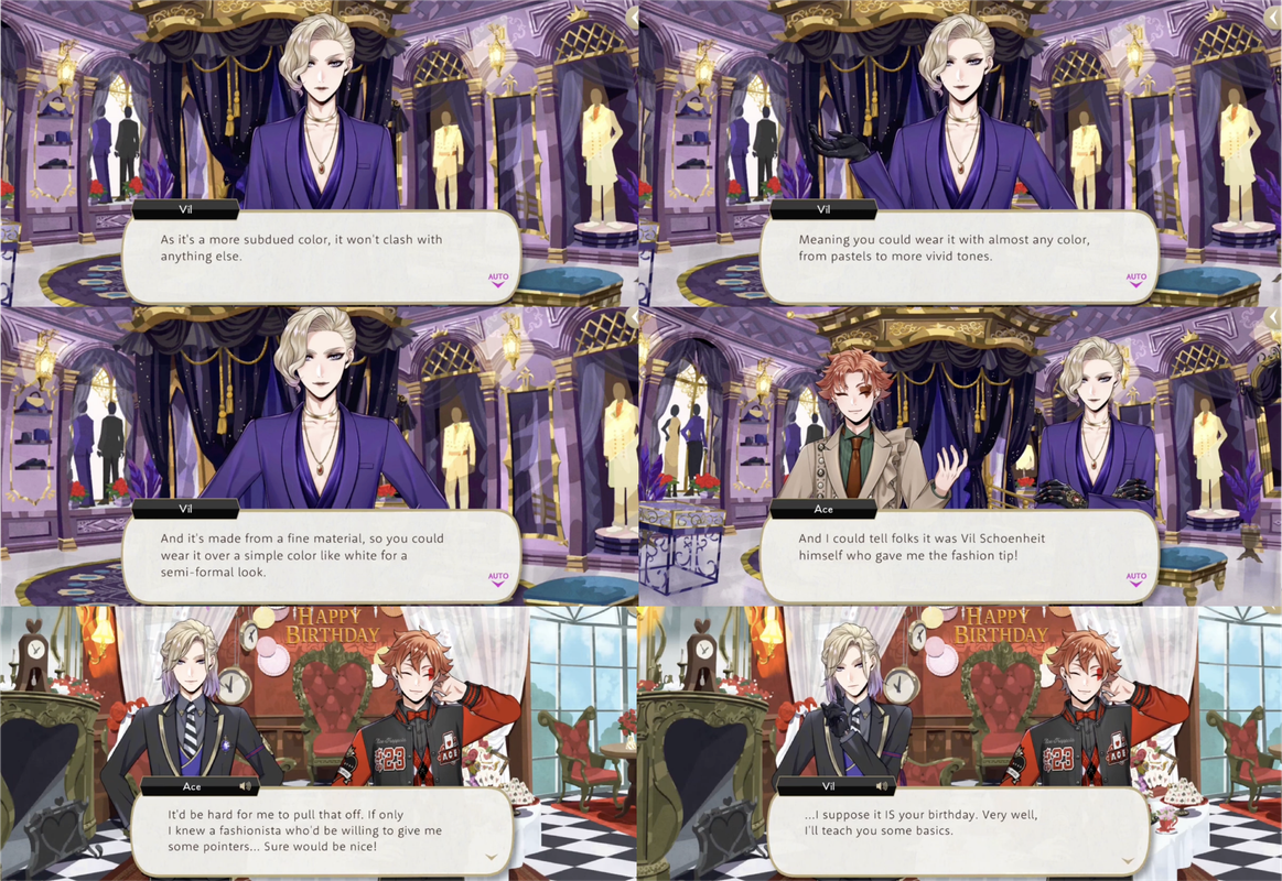 Vil has also given Rook fashion advice in the past, once recommending that he dress up for a play for which he had front-row seats, despite how Rook himself didn’t have any interest in dressing up. Rook explains that Vil gave him wonderful advice and even coordinated his entire ensemble.