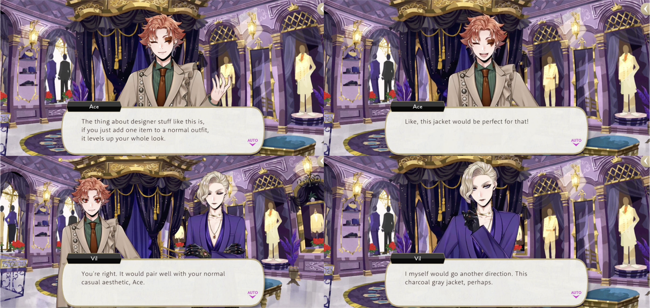 The shop staff attempt to give up and Vil inspires them to keep trying (“Quite groveling and show me what you can DO!”), but it is ultimately Vil himself who arrives at a solution after Grim accidentally pulls down the curtains of a fitting room on top of himself.