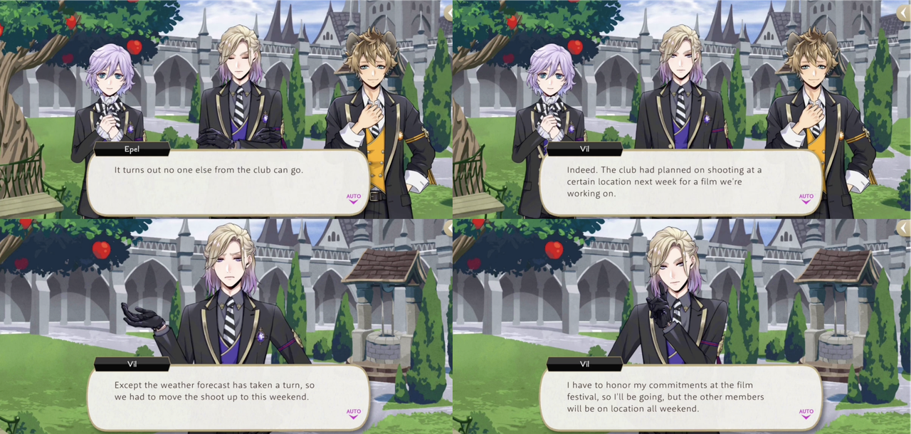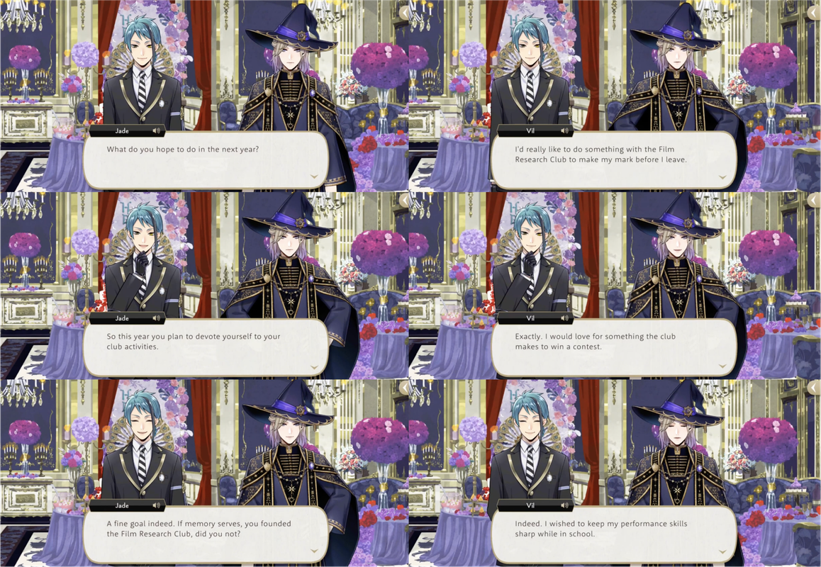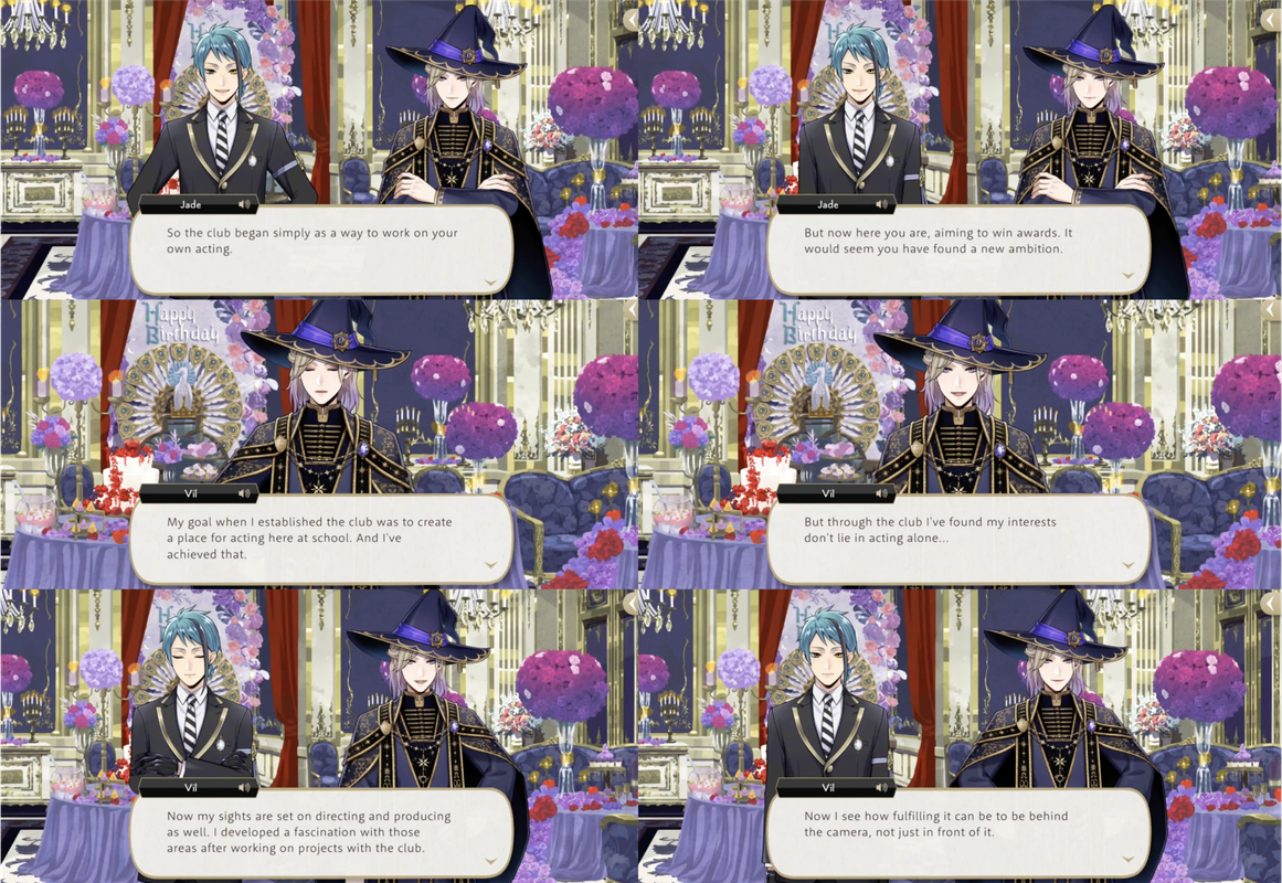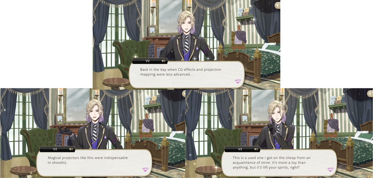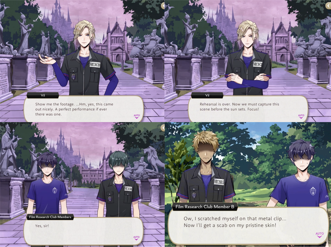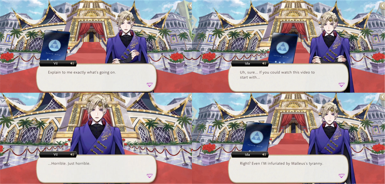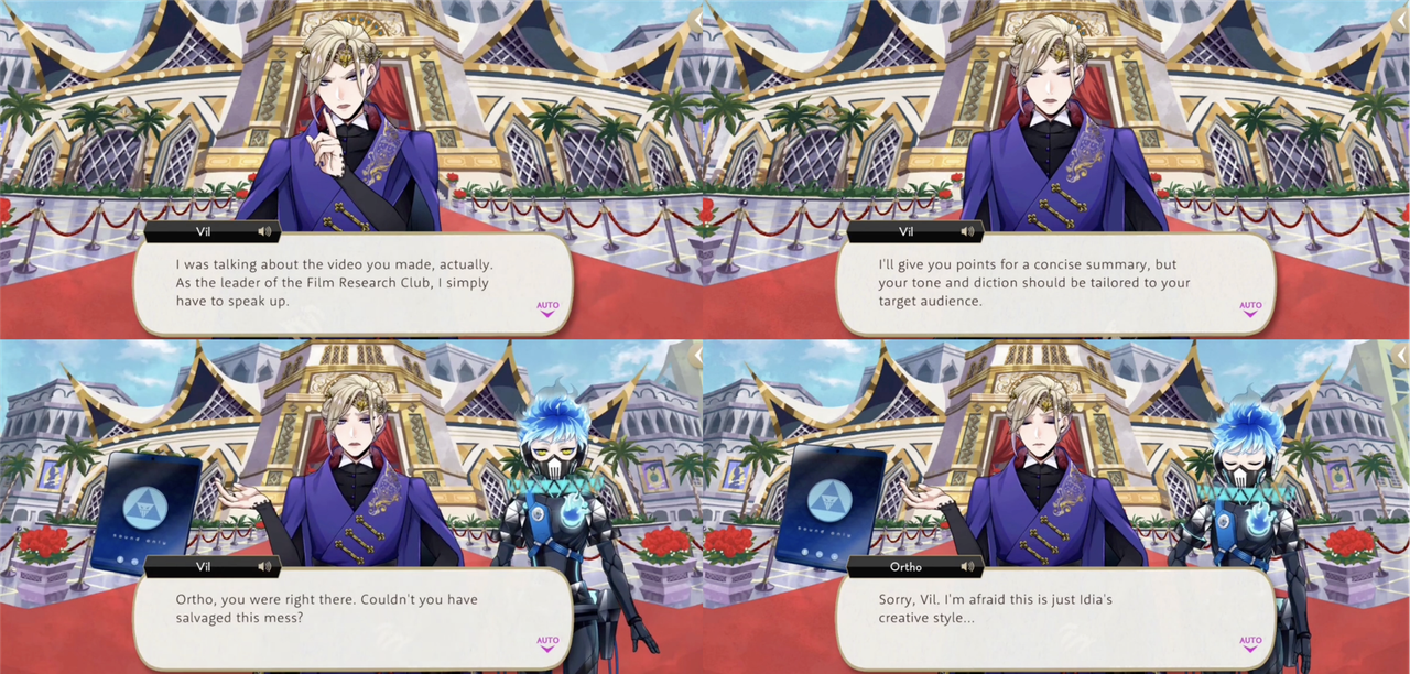 Vil has been critical of Idia-adjacent videos twice in the main story: describing the STYX promotional video as “cheaply made” and calling the video that Idia makes to explain the Book 7 situation “just horrible,” asking Ortho if he couldn’t have done something to salvage the “mess.” (Ortho: “I’m afraid this is just Idia’s creative style…”)