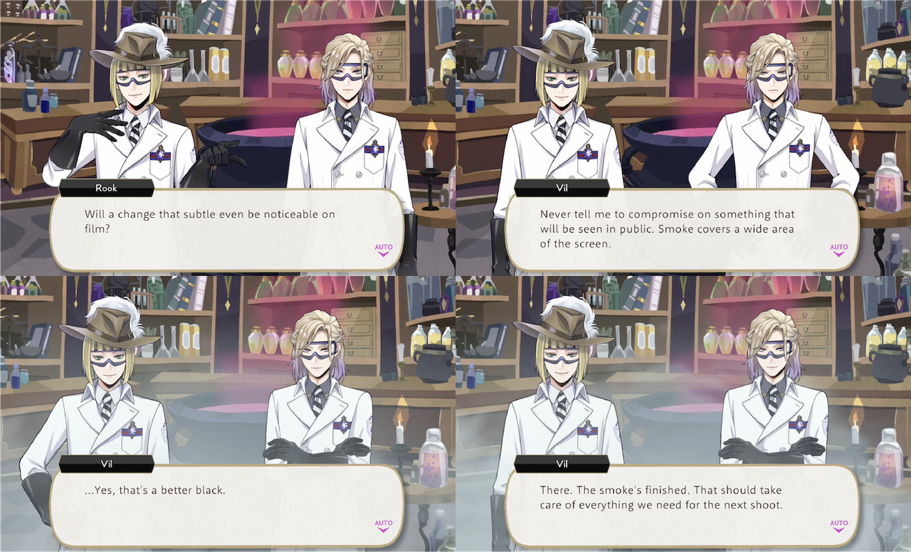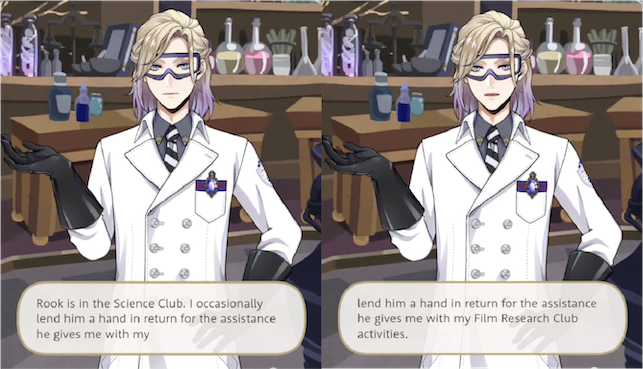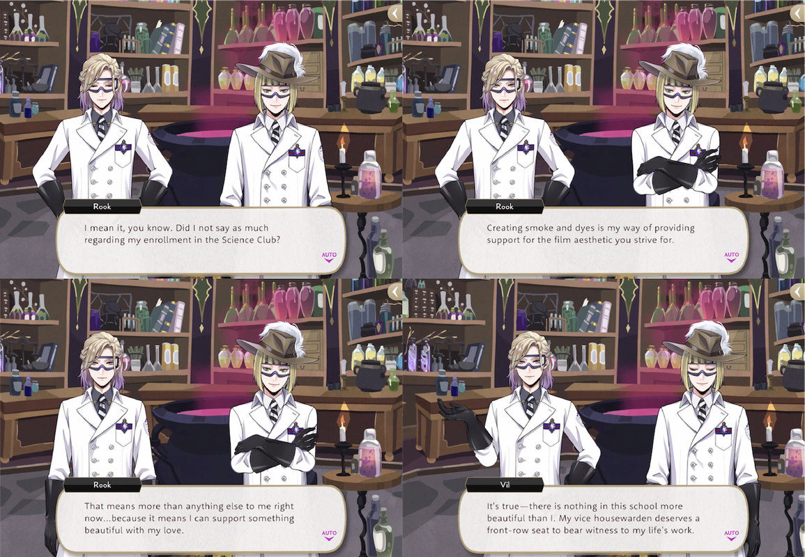 Rook is not a Film Club student, and we learn that he enrolled in the Science club in order to learn how to create smoke and dyes to support Vil’s film aesthetics (“It means that I can support something beautiful with my love”).