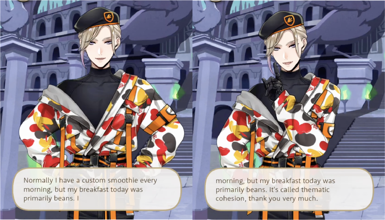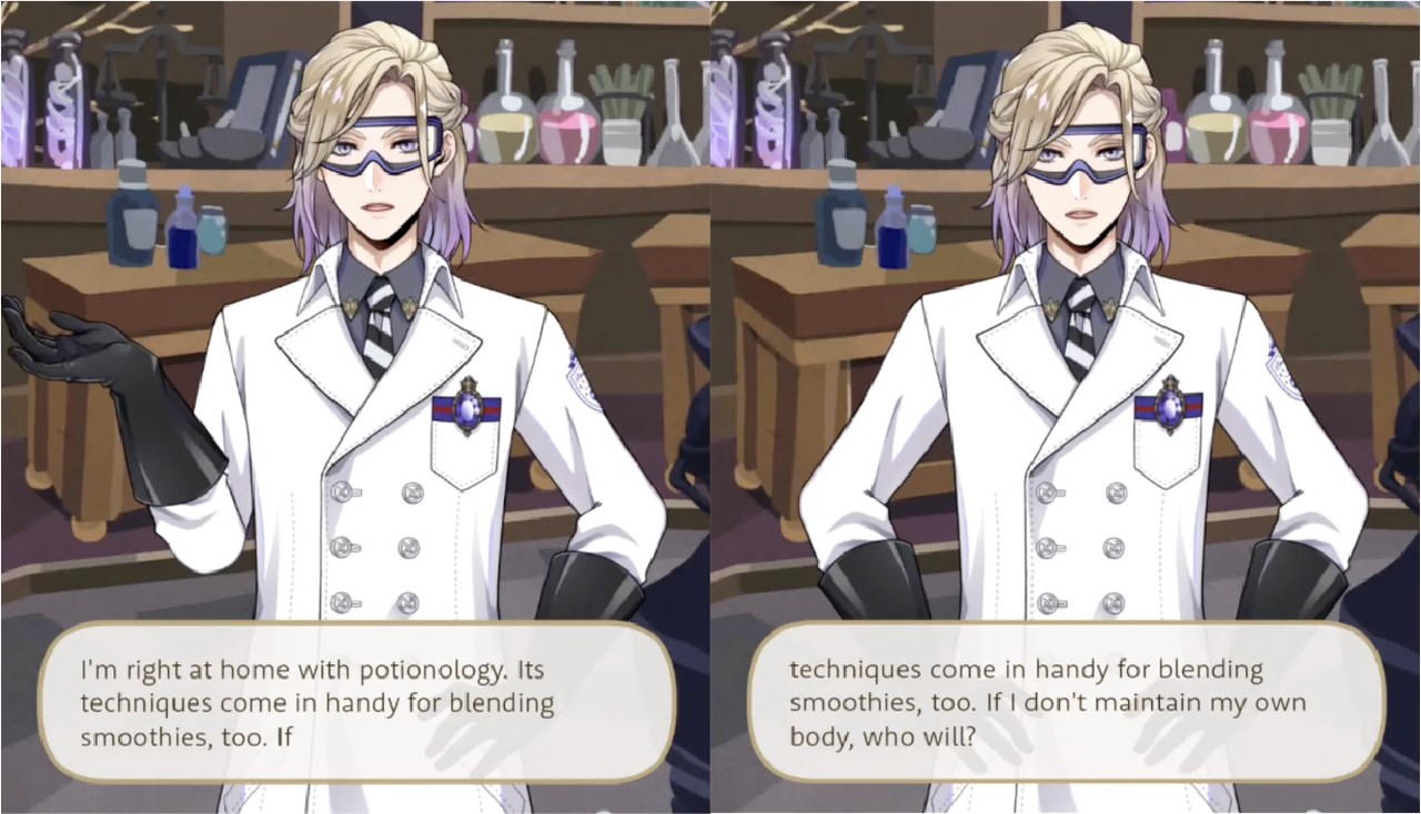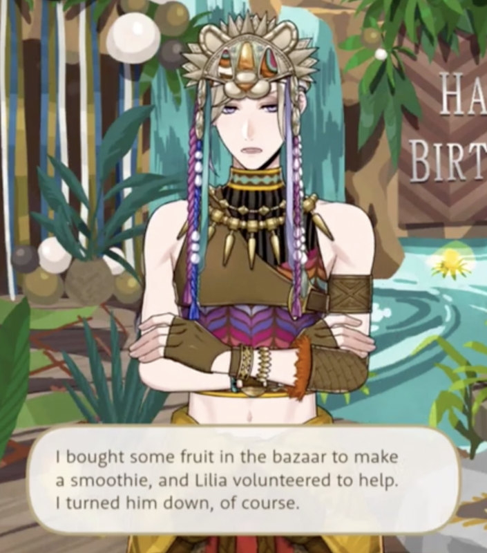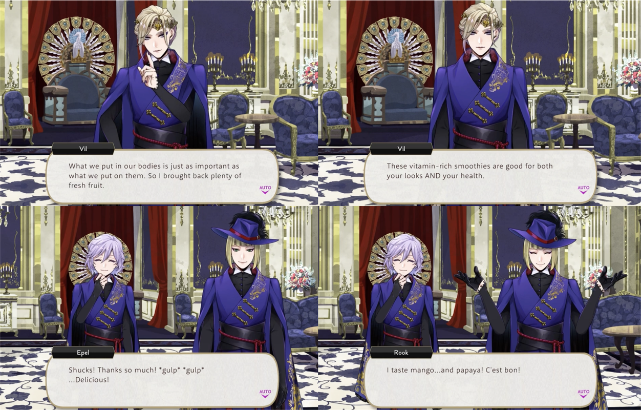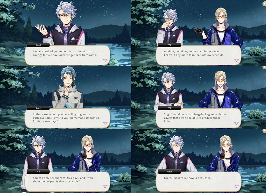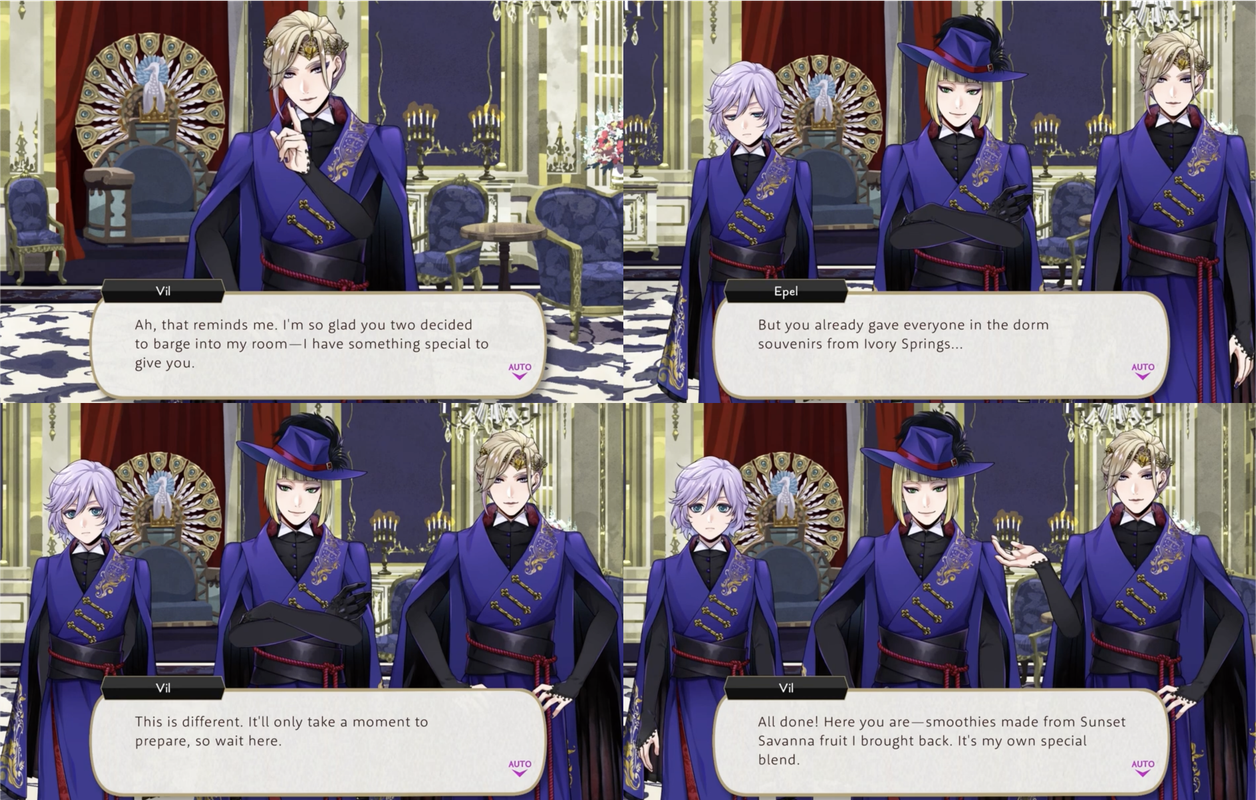 Azul offers up the use of magestones he mined during Vargas Camp in exchange for Vil making homemade smoothies for two days at Mostro Lounge (and for five days of Trey working in the kitchen), Vil mentions buying fruit during the Cloudcalling event for smoothies and prepares some for both Rook and Epel, saying, “What we put in our bodies is just as important as what we put on them. So I brought back plenty of fresh fruit. These vitamin-rich smoothies are good for both your looks AND your health.”