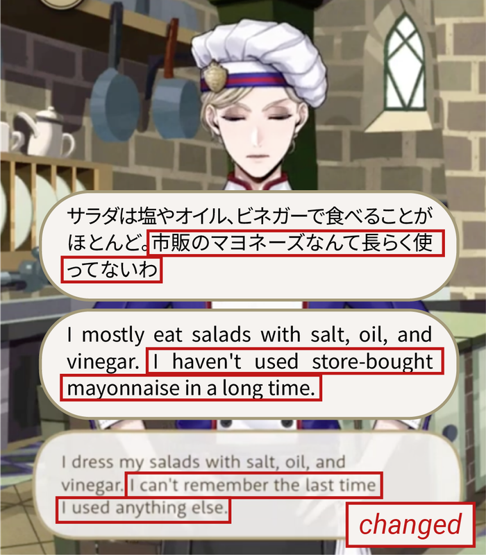 This is referenced in a voice line where Vil says it has been a long time since he last used store-bought mayonnaise on a salad, removed from EN.