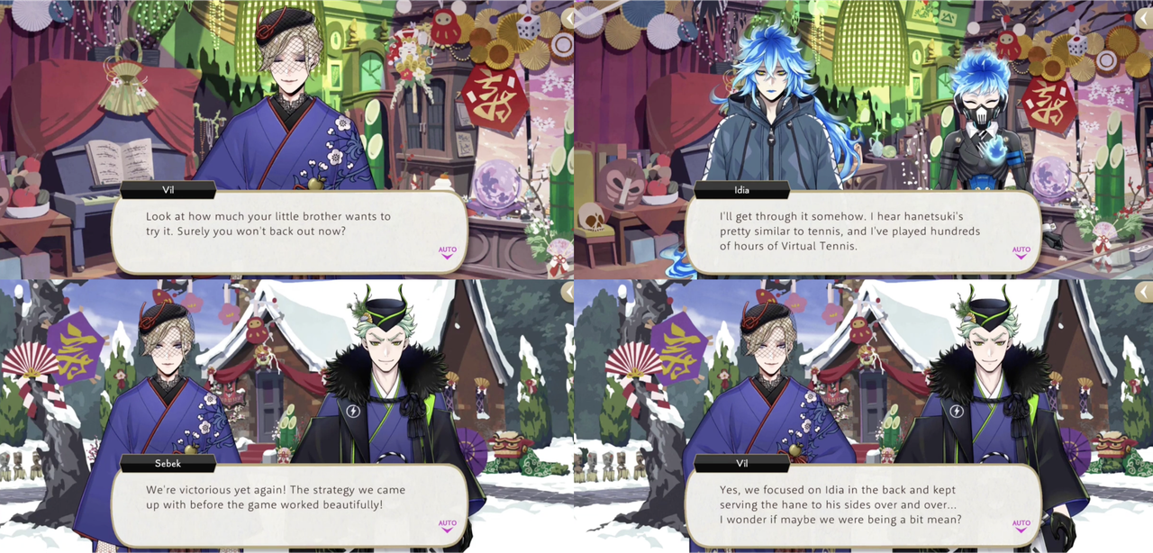 After spending enough money to qualify for participating in a challenge at the school store during New Year’s Idia refuses, but Vil points out how badly Ortho wants to play, and Idia relents. In the end Vil and Sebek win the match by focusing on Idia, with Vil saying, “I wonder if maybe we were being a bit mean?”