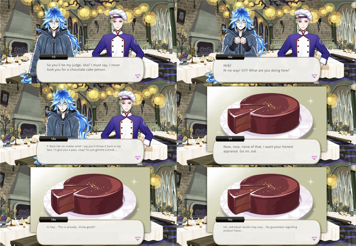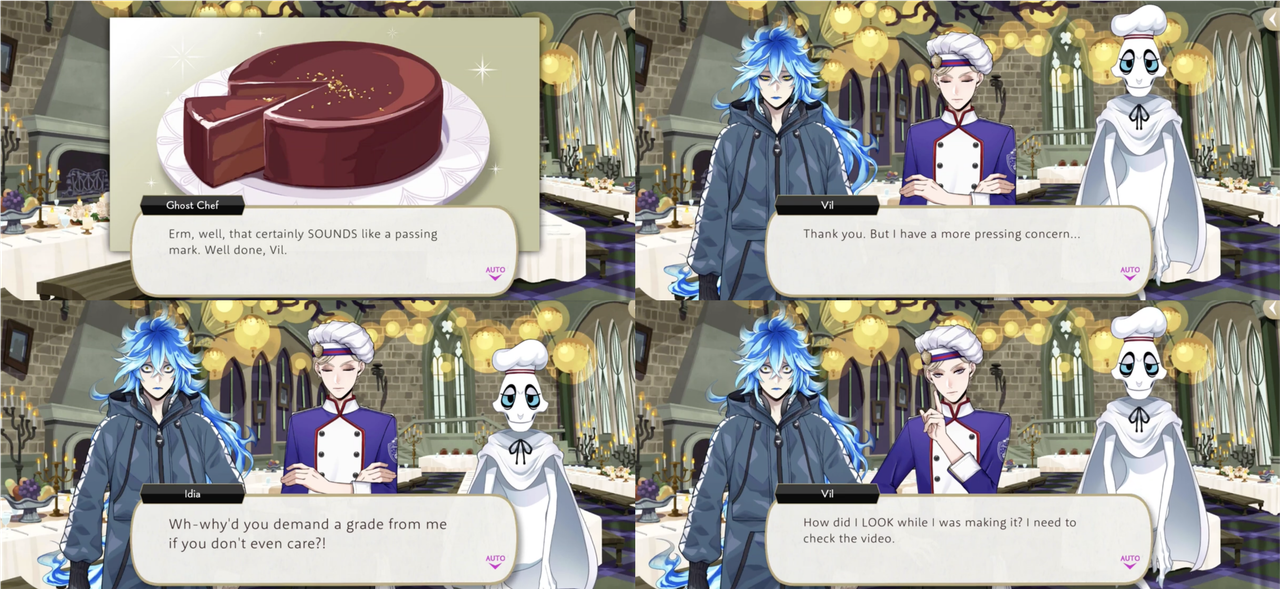 Vil says he wants Idia’s honest opinion (Idia: “This is actually…kinda good!?”), but after receiving it he says he has a more pressing concern: how he looked while he was making it. (Idia: “Why’d you demand a grade from me if you don’t even care?!”)