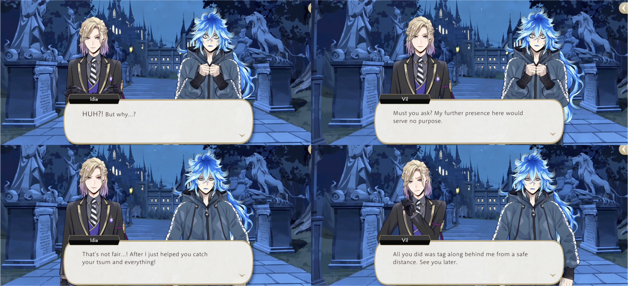 Having captured his tsum Vil tries to leave, and when Idia argues that he helped catch Vil’s tsum so Vil ought help him catch his own Vil responds, “All you did was tag along behind me from a safe distance.”