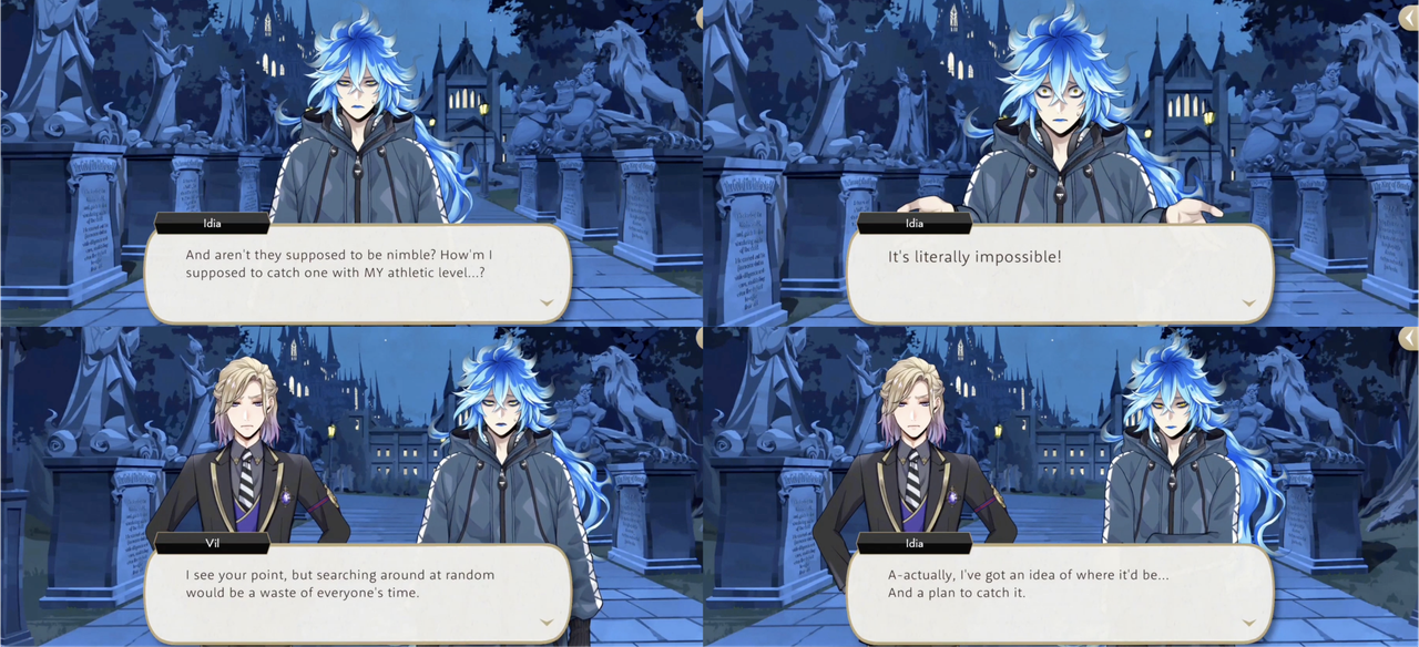 The third tsum event begins with Vil ordering Idia to chase down the tsums with him (Vil’s tsum is caught striking a pose under a light).