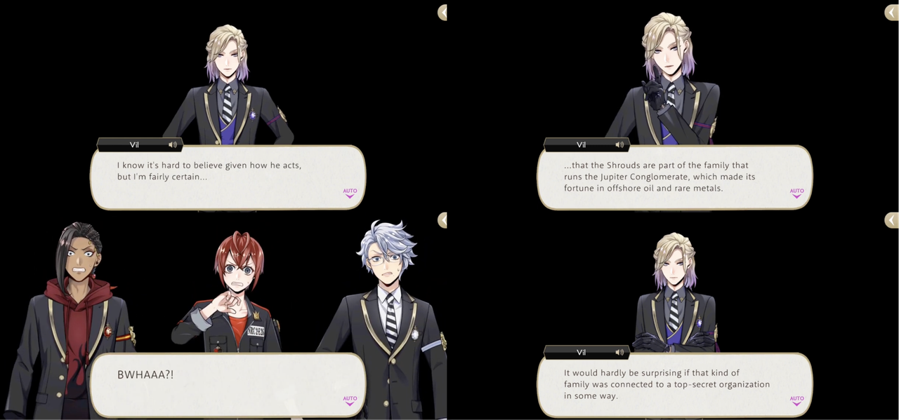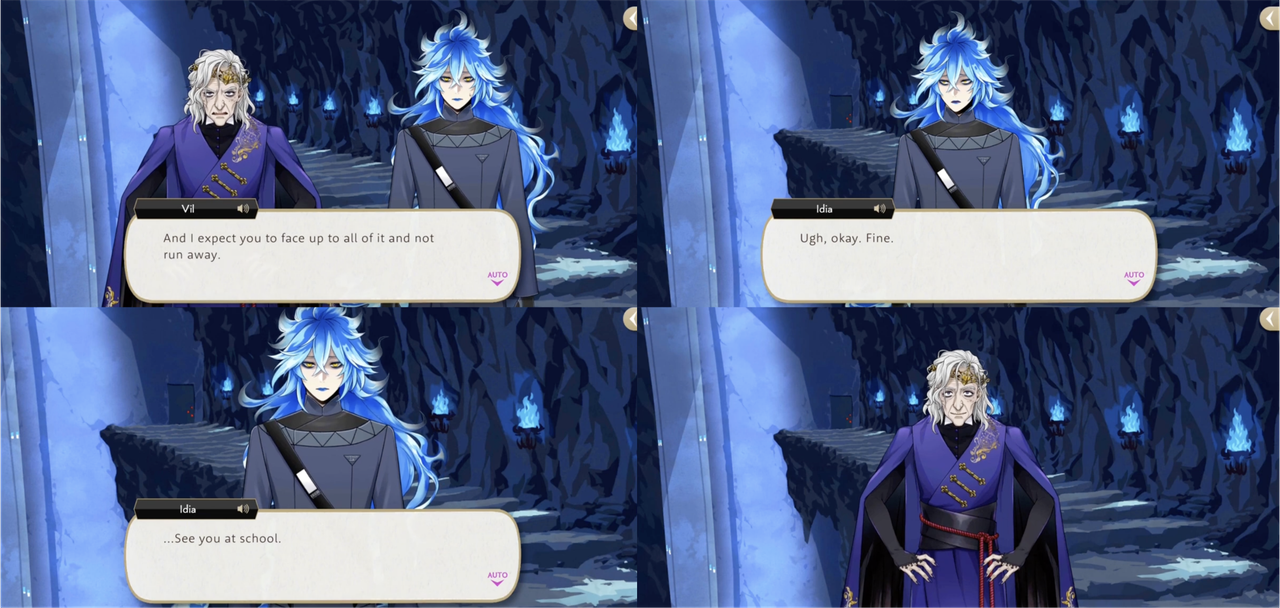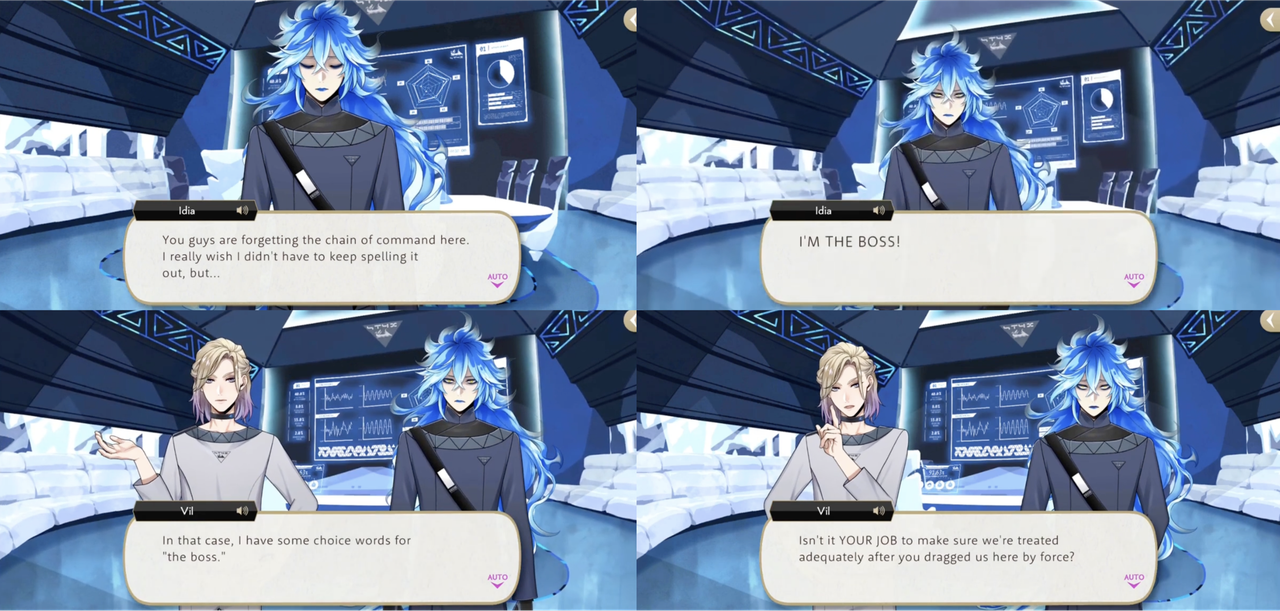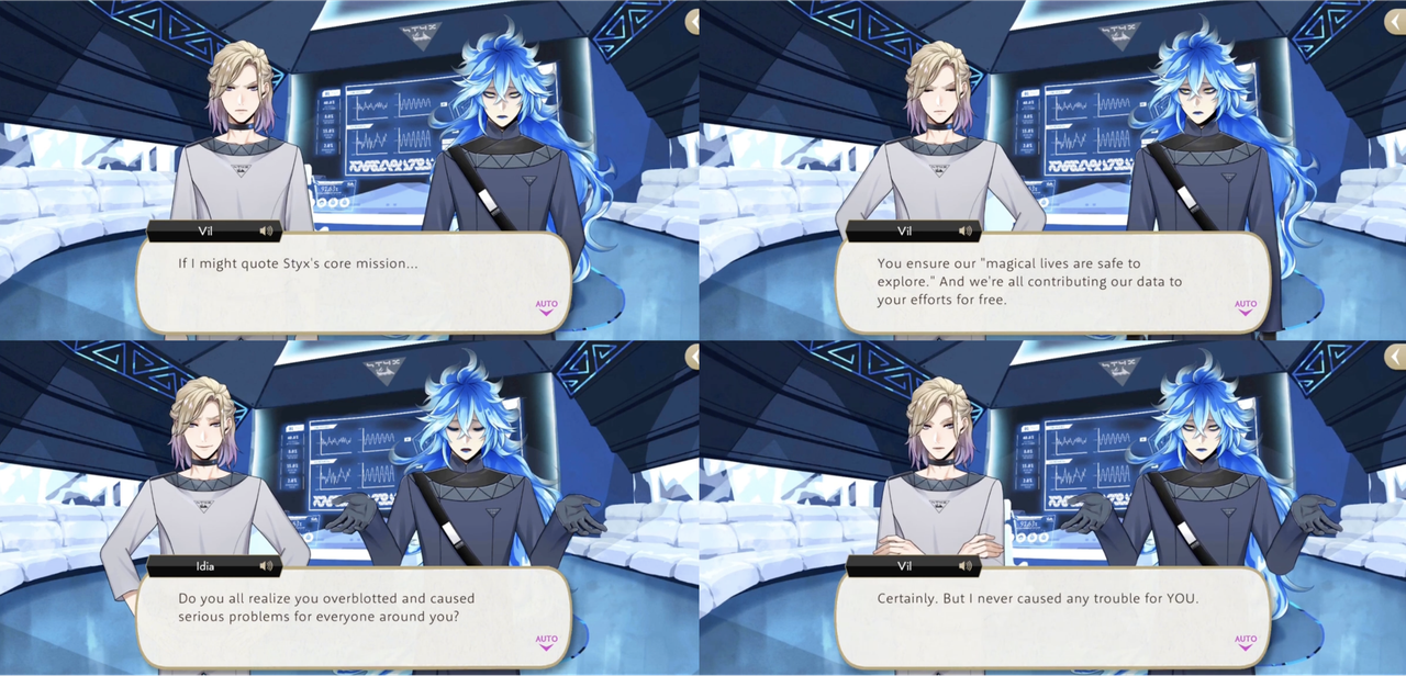 Idia loses his patience with the kidnapped students, emphasizes that they have forgotten the chain of command and he is the boss, but Vil is unfazed, pointing out that it is his job to make sure they are treated adequately and quoting STYX’s core mission to emphasize his point. (Idia: “Do you all realize you overblotted and caused serious problems for everyone around you?” – Vil: “Certainly. But I never caused any trouble for YOU.”)