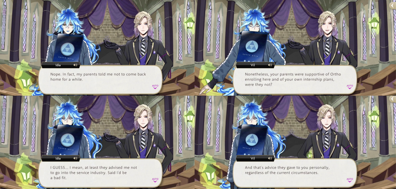 When Idia reveals that his parents have asked him not to go home for a while after the incident of Book 6, Vil points out that they were supportive of Ortho’s enrollment at the school and of his own internship plans.