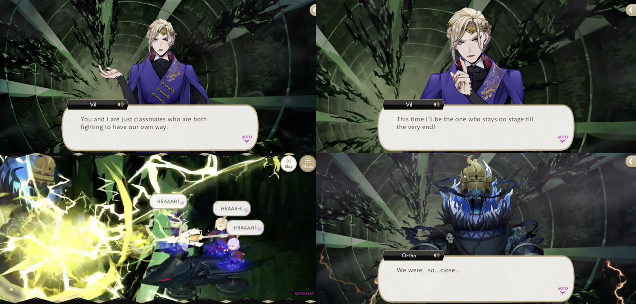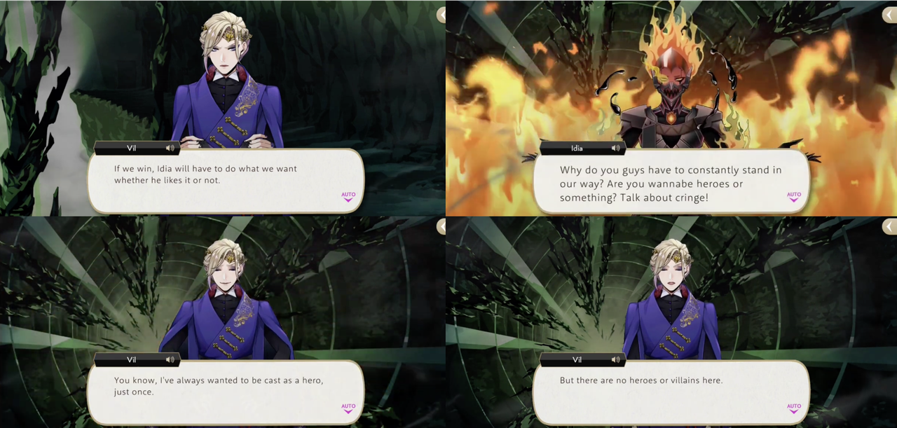 In the final battle with the overblotted Idia Vil explains, “l’ve always wanted to be cast as a hero, just once. But there are no heroes or villains here. You and I are just classmates who are both fighting to have our own way,” saying that he will be the one to stay on stage until the end.