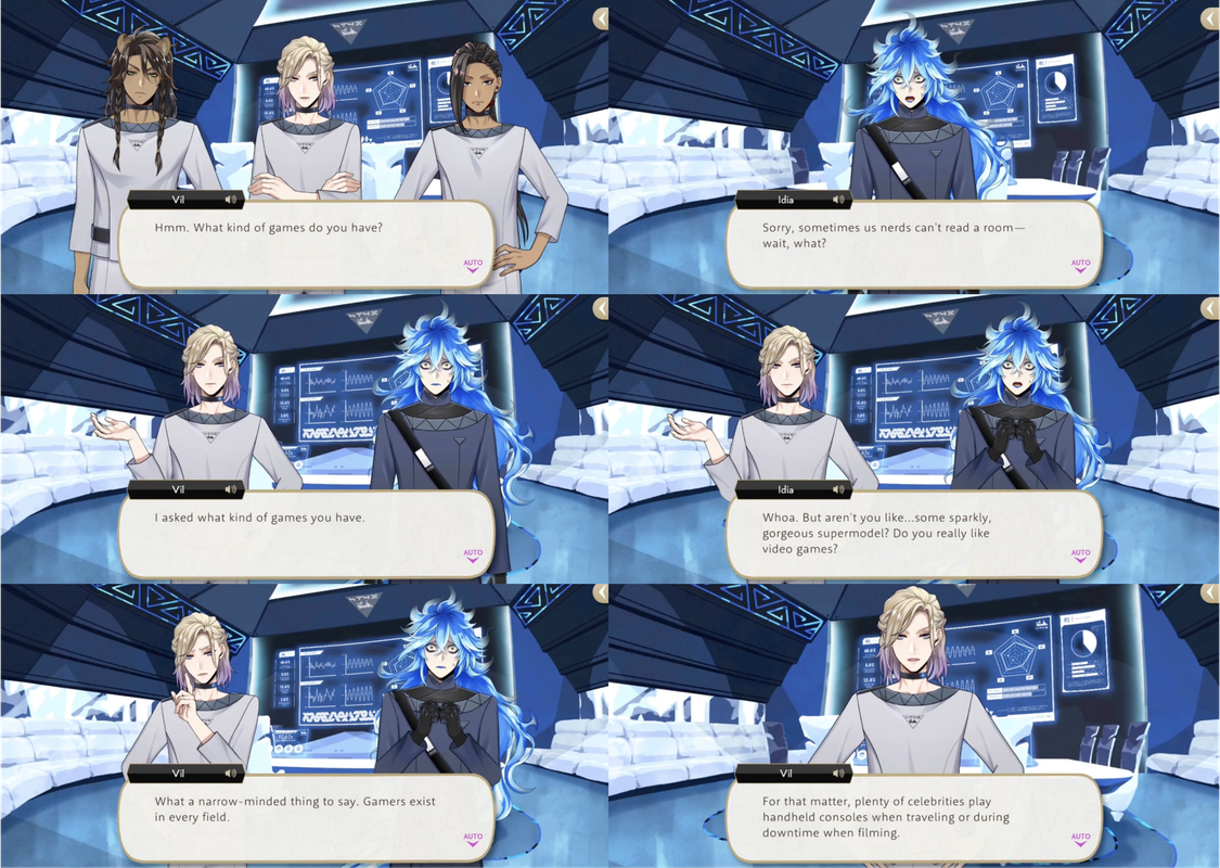 Vil surprises Idia by being interested in the video games available at STYX, saying that Idia’s assumption that “some sparkly, gorgeous supermodel” wouldn’t like video games is narrow minded, as “gamers exist in every field.”