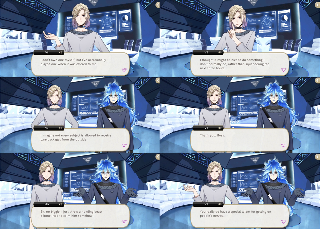 Vil thanks Idia for the “care package” that is the set of skincare products that Rook brings him from NRC, which Idia allows and personally delivers to Vil. (Idia: “I just threw a howling beast a bone. Had to calm him somehow.” – Vil: “You really do have a special talent for getting on people’s nerves.”)