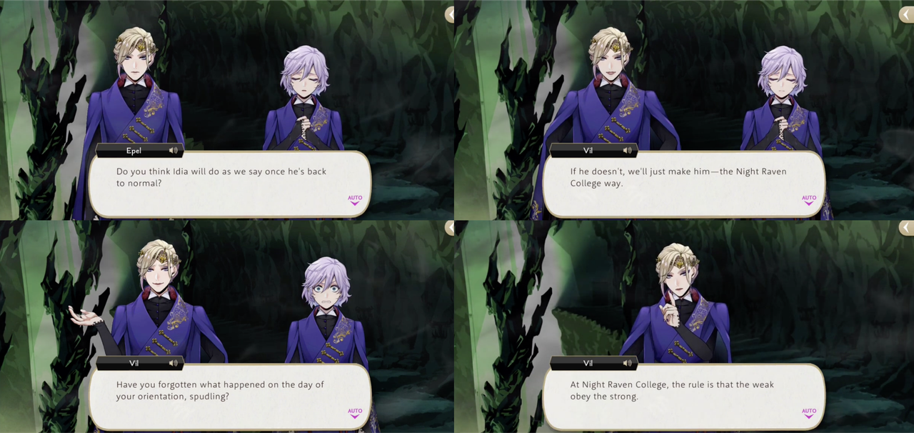 When Epel wonders if Idia will do as they say after he recovers from his overblot Vil responds, “At Night Raven College, the rule is that the weak obey the strong. If we win, Idia will have to do what we want whether he likes it or not.”