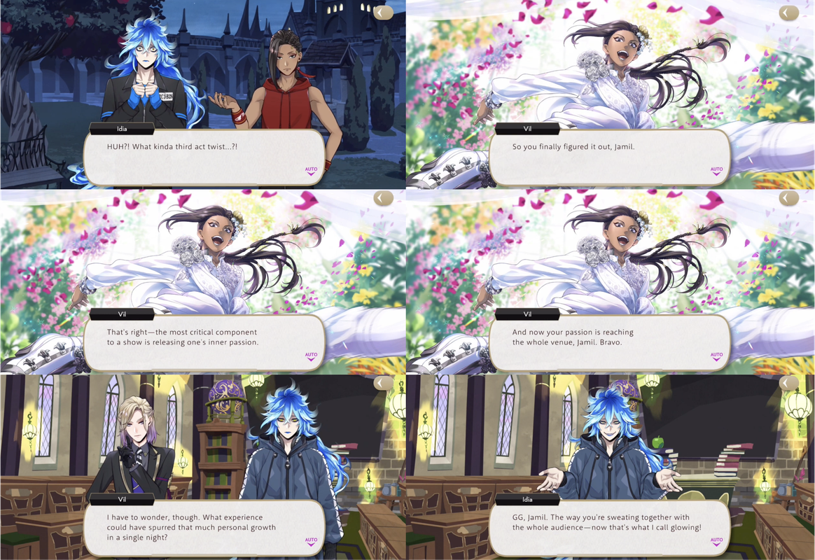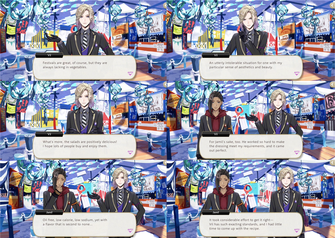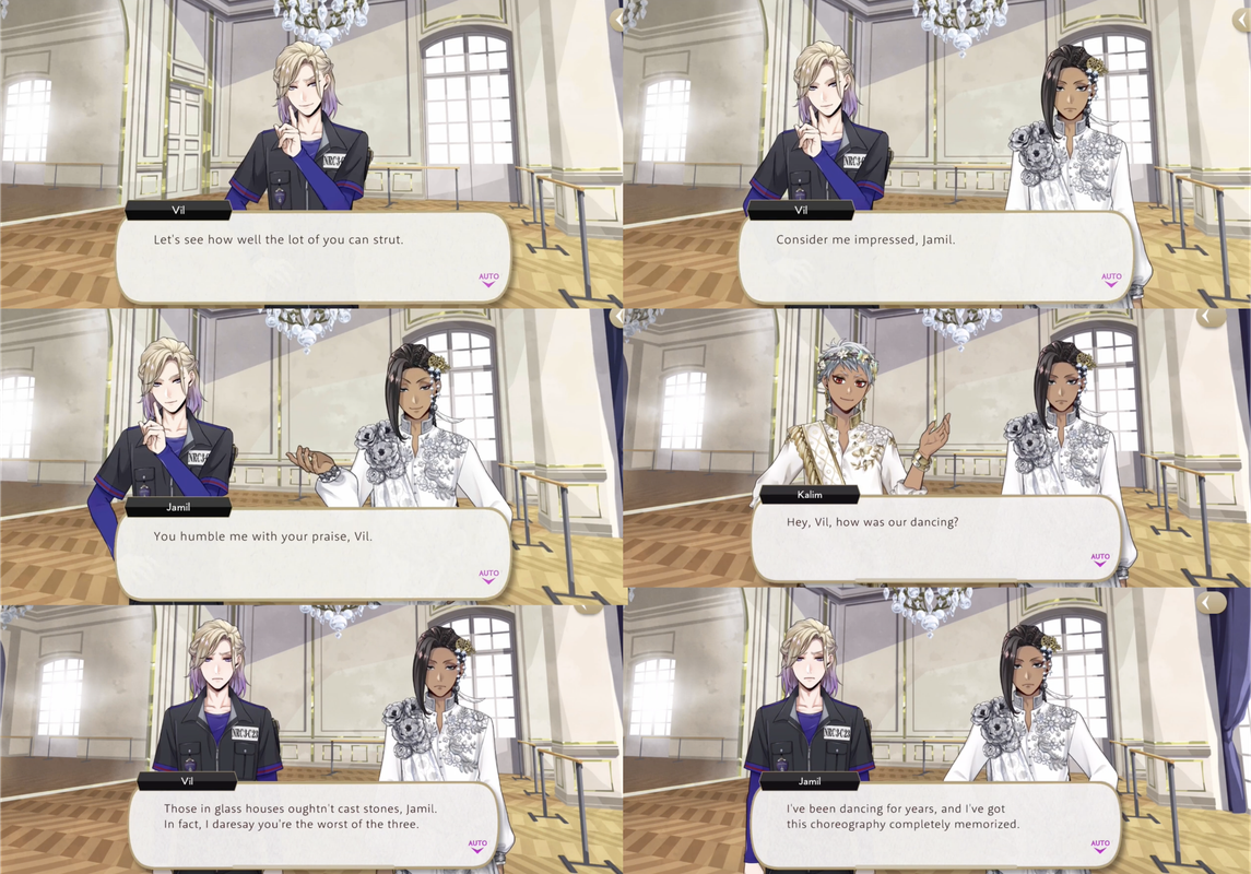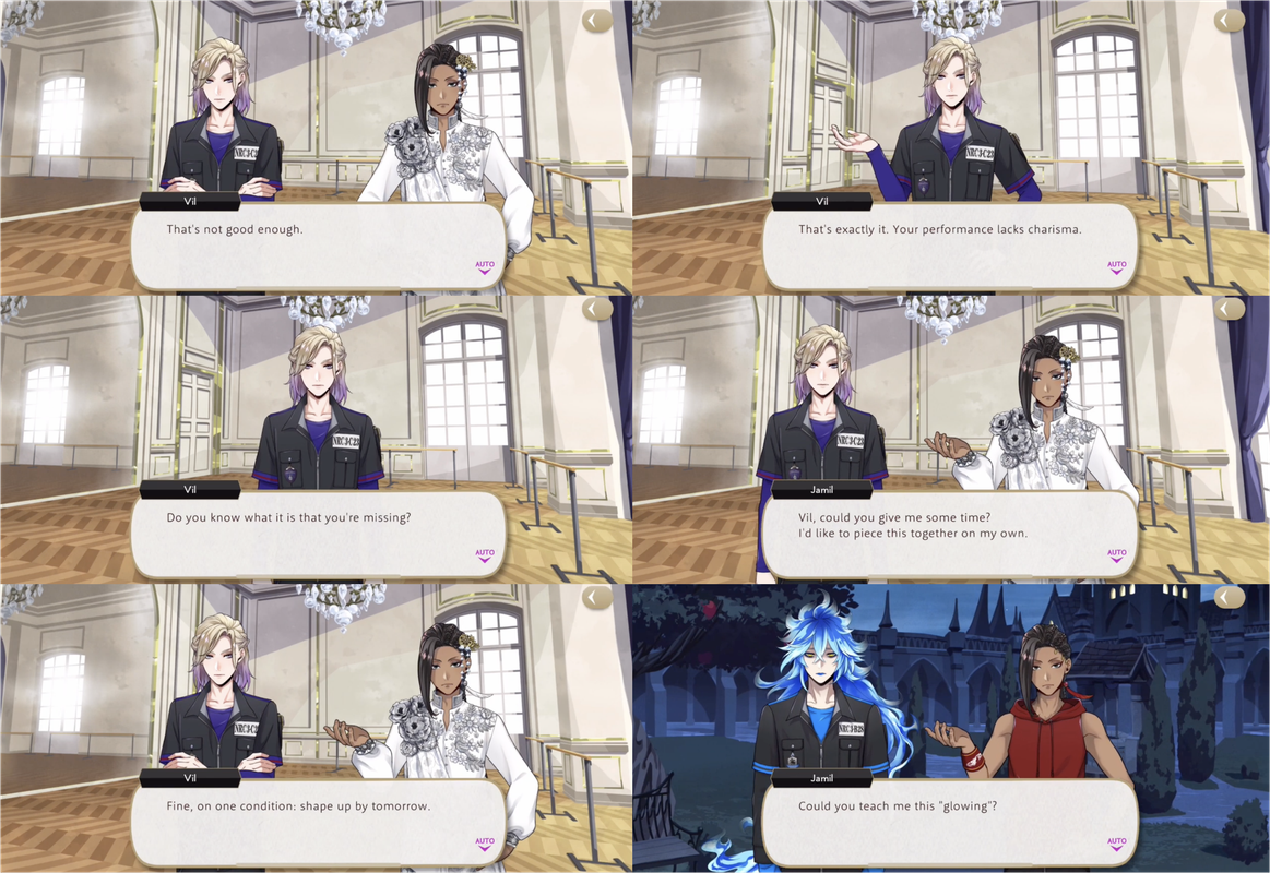 Vil is impressed by Jamil’s catwalk during Fairy Gala but not by his dancing, saying his performance lacks charisma and asking if he knows what he is missing. Jamil asks to be allowed to discover his problem on his own, learns a certain type of dance from Idia, and earns Vil’s praise.
