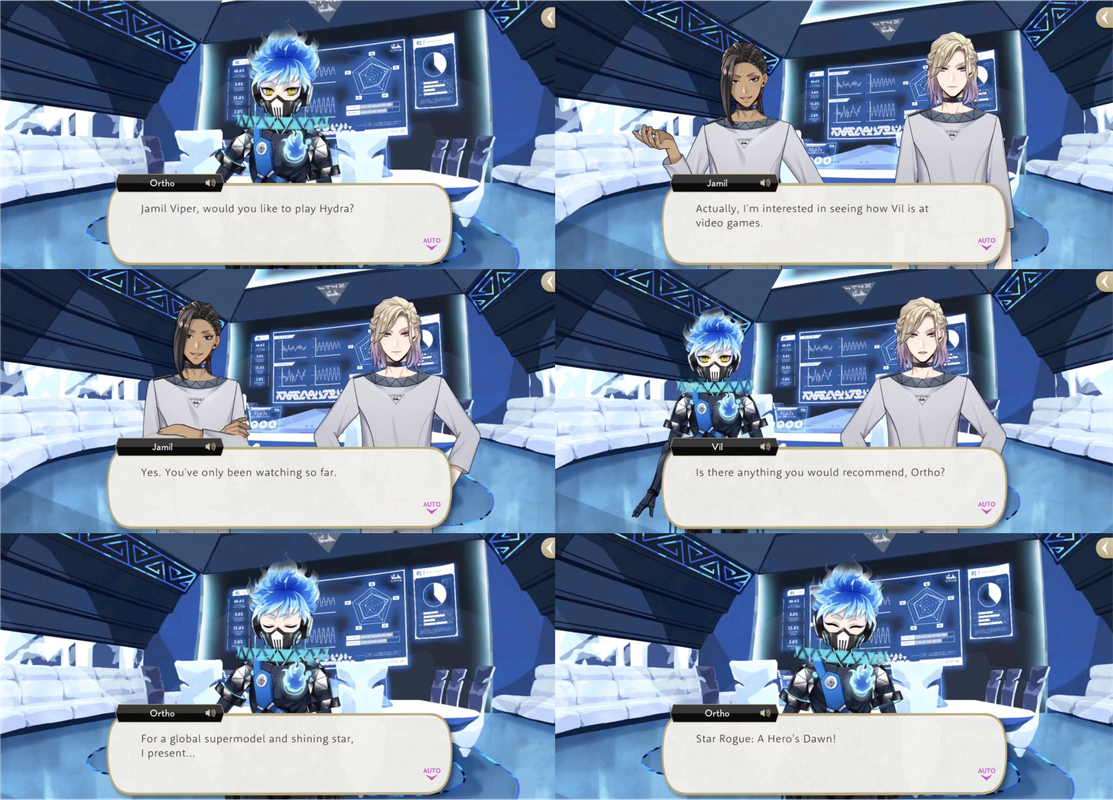 When offered a video game while captive at STYX in Book 6 Jamil instead defers his turn to Vil. Ortho recommends “Star Rogue: A Hero’s Dawn” for “a global supermodel and shining star.”