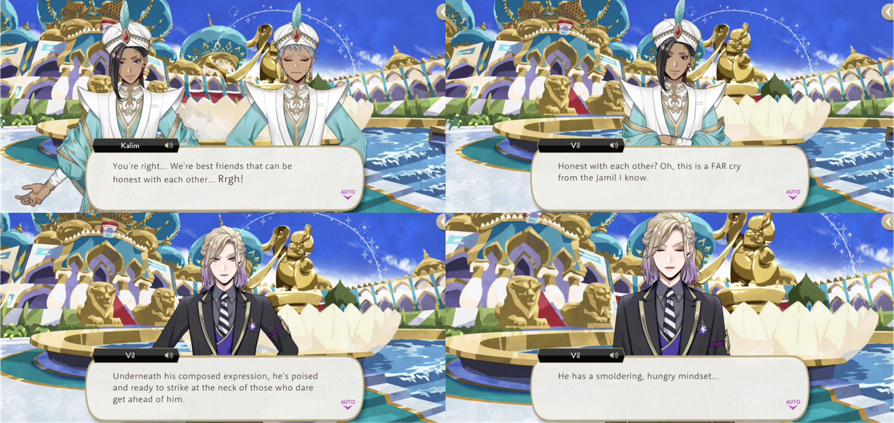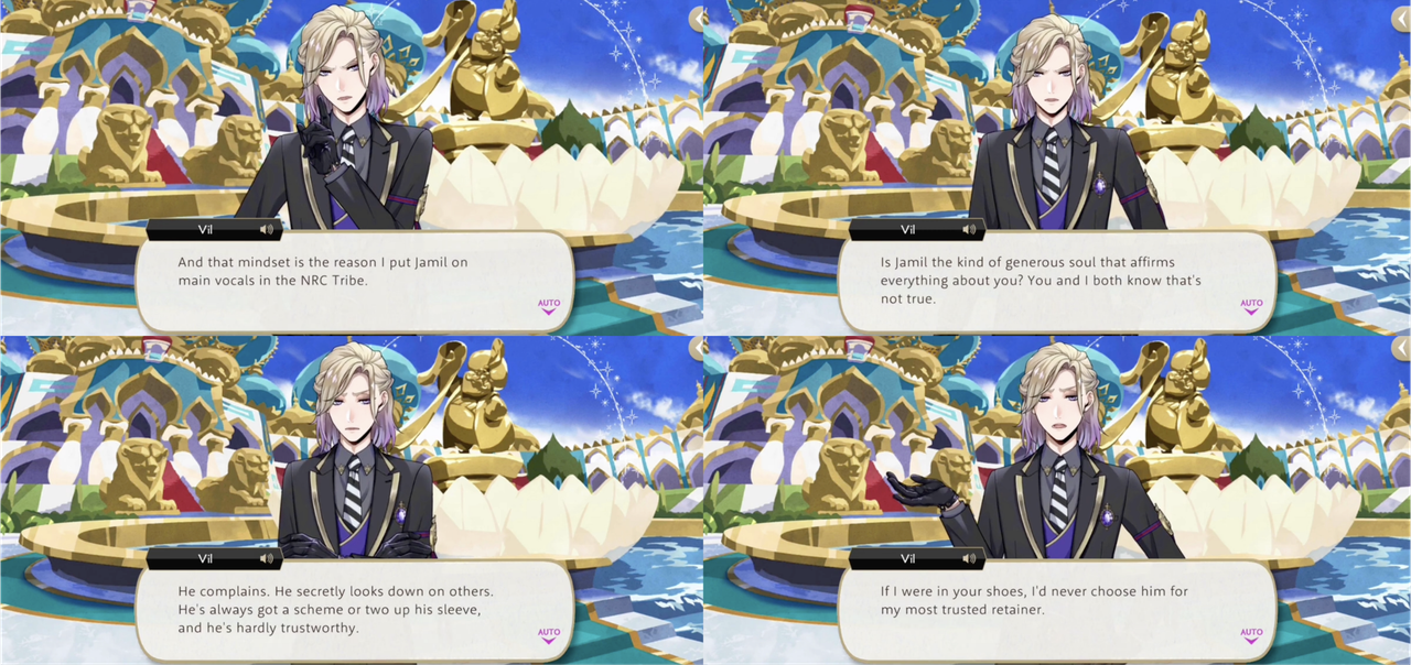 Vil asks Kalim if Jamil is “the kind of generous soul that affirms everything about you,” saying that both he and Kalim know that such is not true: “He complains. He secretly looks down on others.