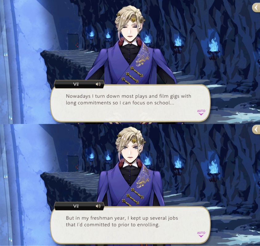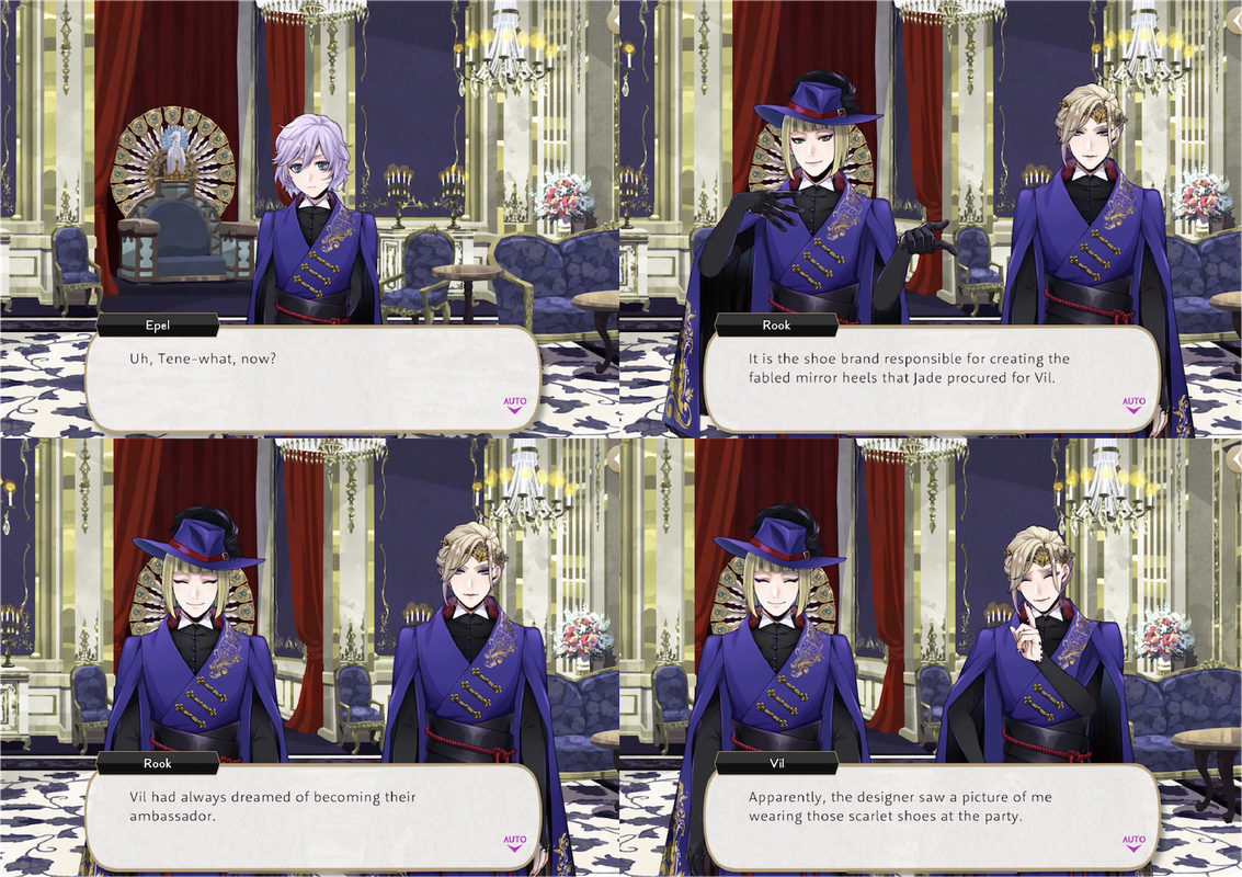 Vil is also hired as ambassador for shoe brand Ténèbres while enrolled at NRC, after Jade procures him a pair of the brand’s “mirror heels” and the designer sees a picture of him wearing them at a party.