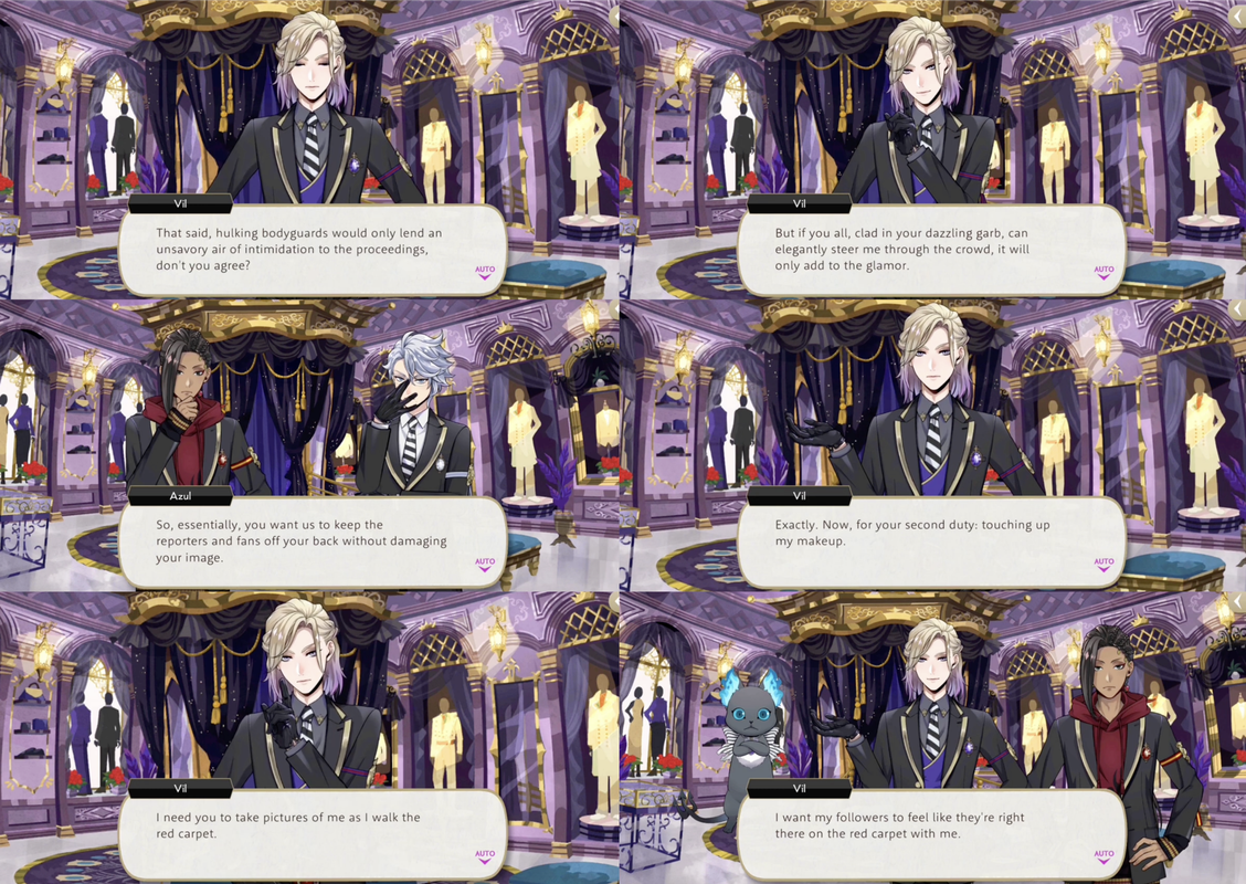 He brings Ace, Jamil, Azul, the prefect and Grim along to carry his shopping bags, protect him from paparazzi and fans, touch up his makeup and take pictures of him as he walks the red carpet. They are allowed to keep clothing that they wear as a part of fulfilling these roles in compensation.
