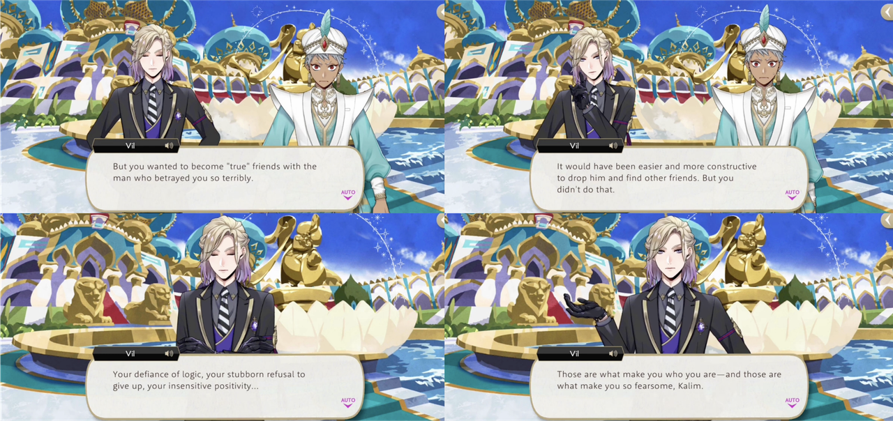 It is Vil who wakes up Kalim from his dream in Book 7 by pointing out that it would have been easier for him to find friends other than Jamil, saying, “Your defiance of logic, your stubborn refusal to give up, your insensitive positivity…those are what make you who you are—and those are what make you so fearsome, Kalim.”