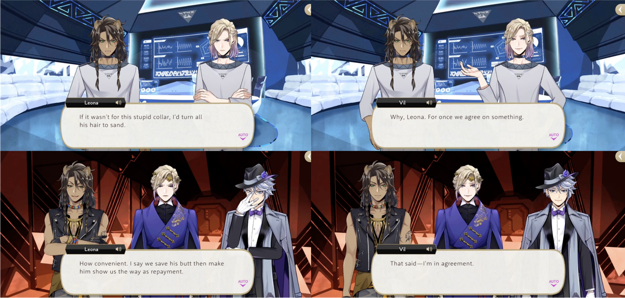 When Leona dismisses Crowley’s idea to retire Malleus in Book 2 Vil agrees with him, and they are simultaneously competitors and allies during Phantom Bride when they both become motivated to show up Malleus.