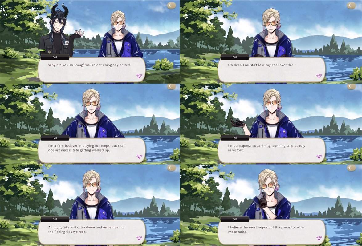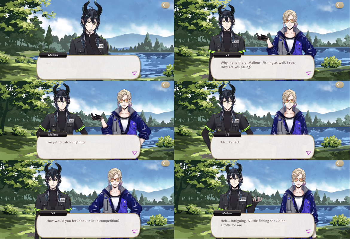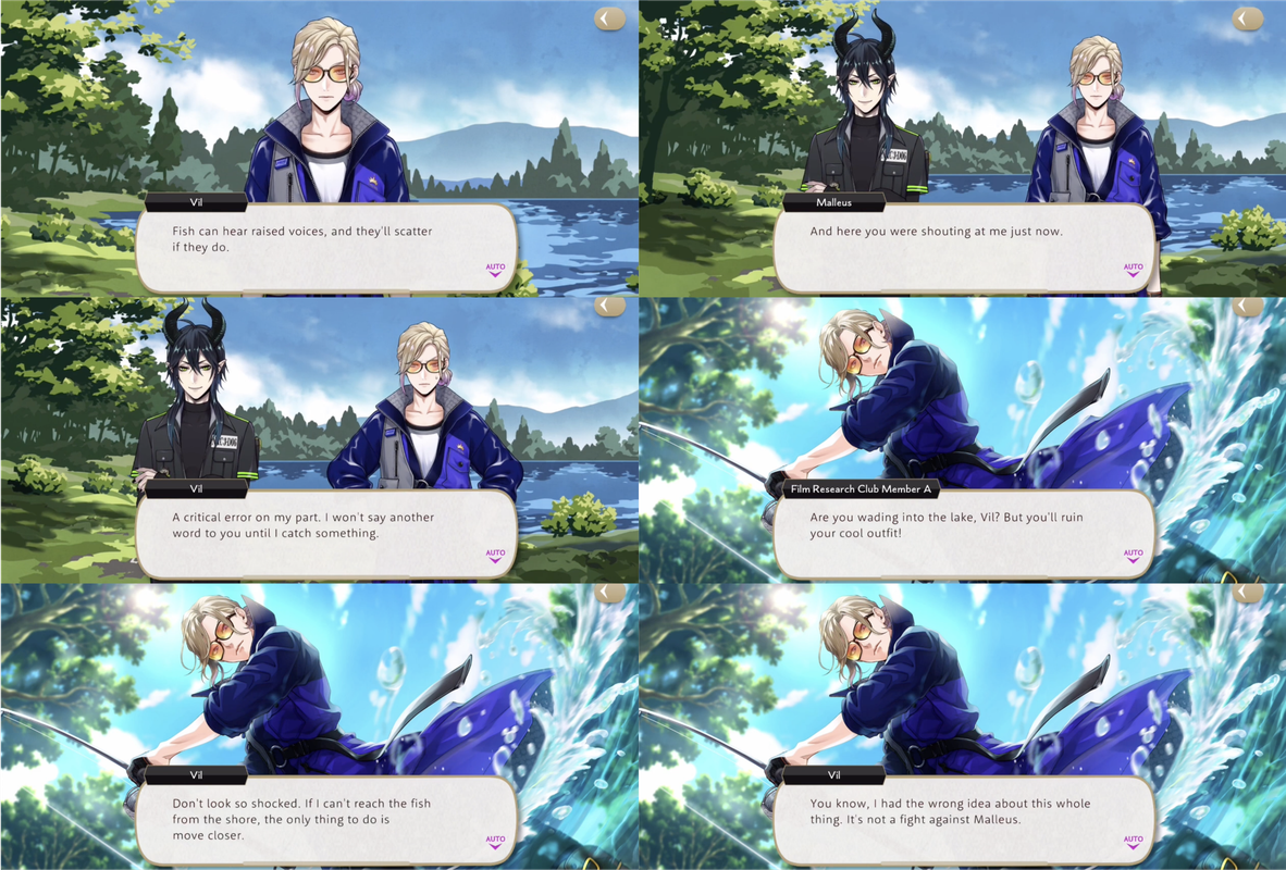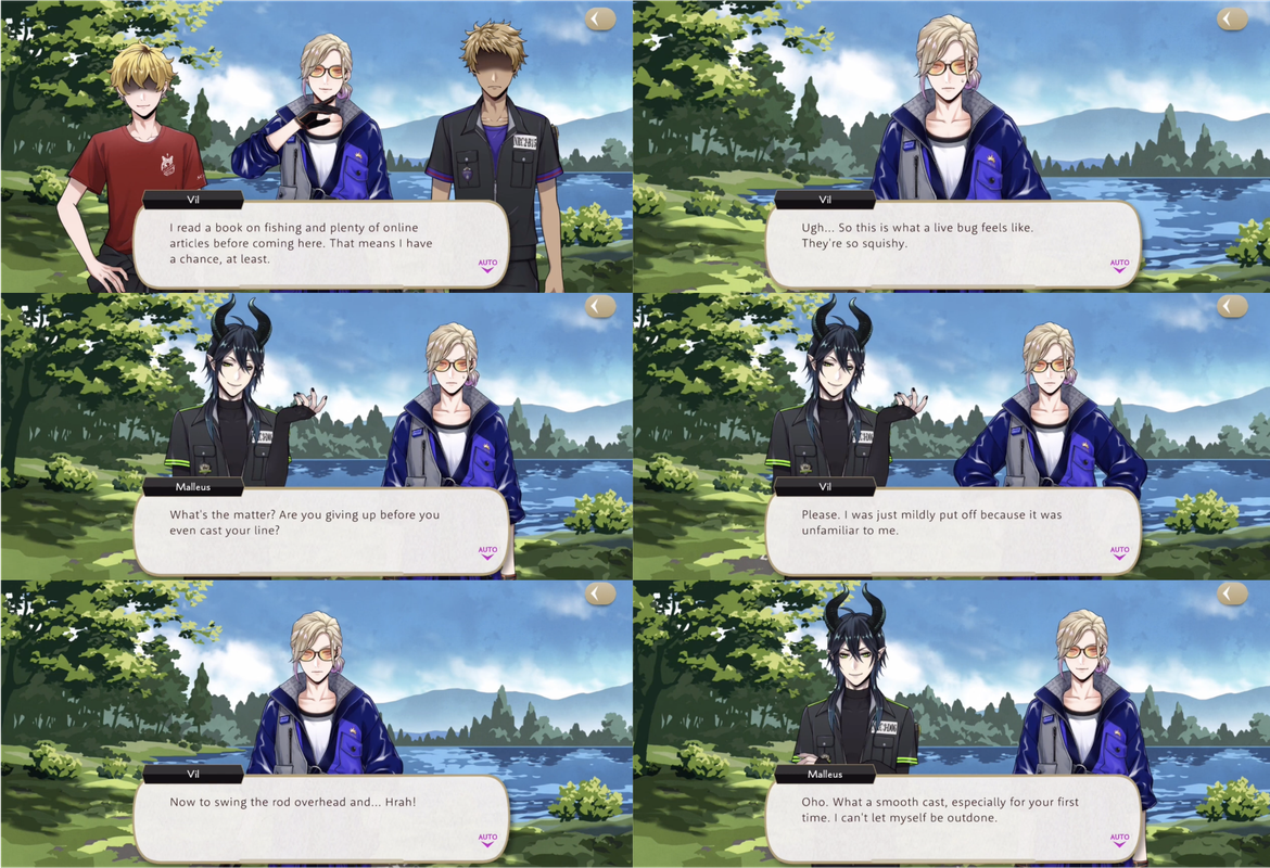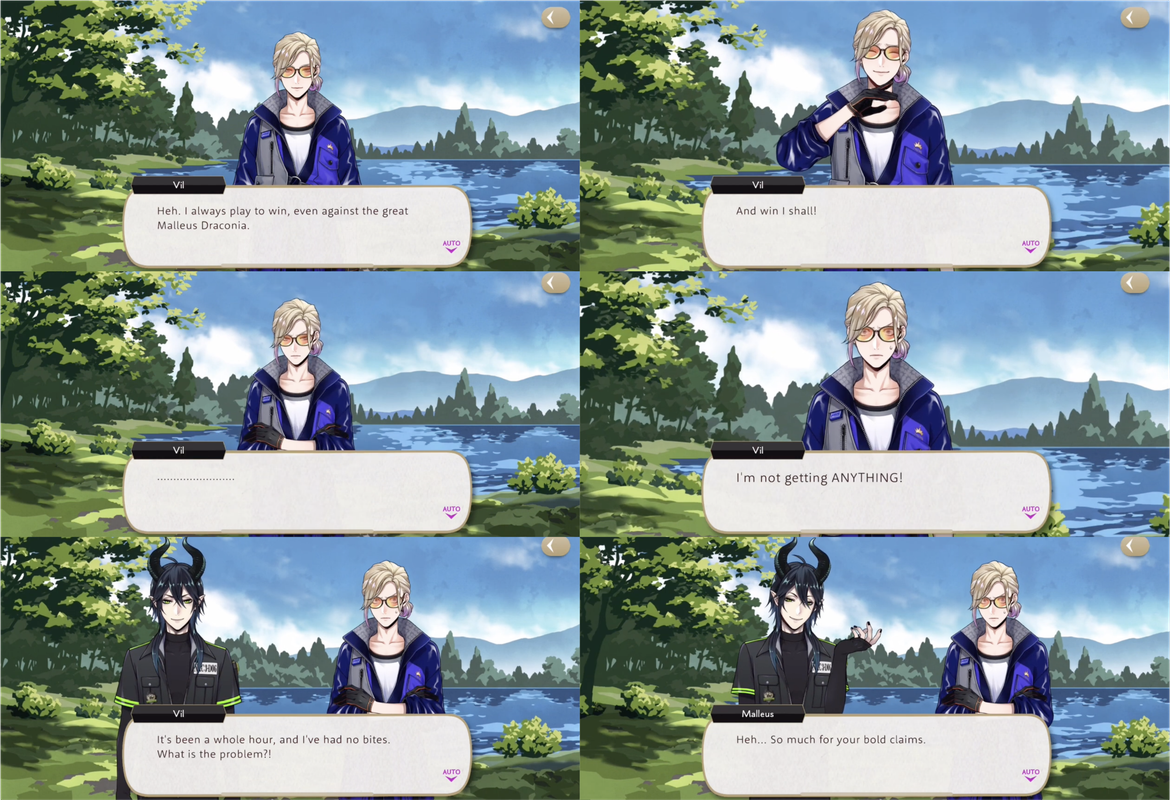 Vil says that he read a book on fishing and plenty of online articles so he believes he has a chance, but he is “mildly put off” by the sensation of using bugs for bait. Malleus compliments Vil on his casting and Vil declares, “I always play to win, even against the great Malleus Draconia. And win I shall!”