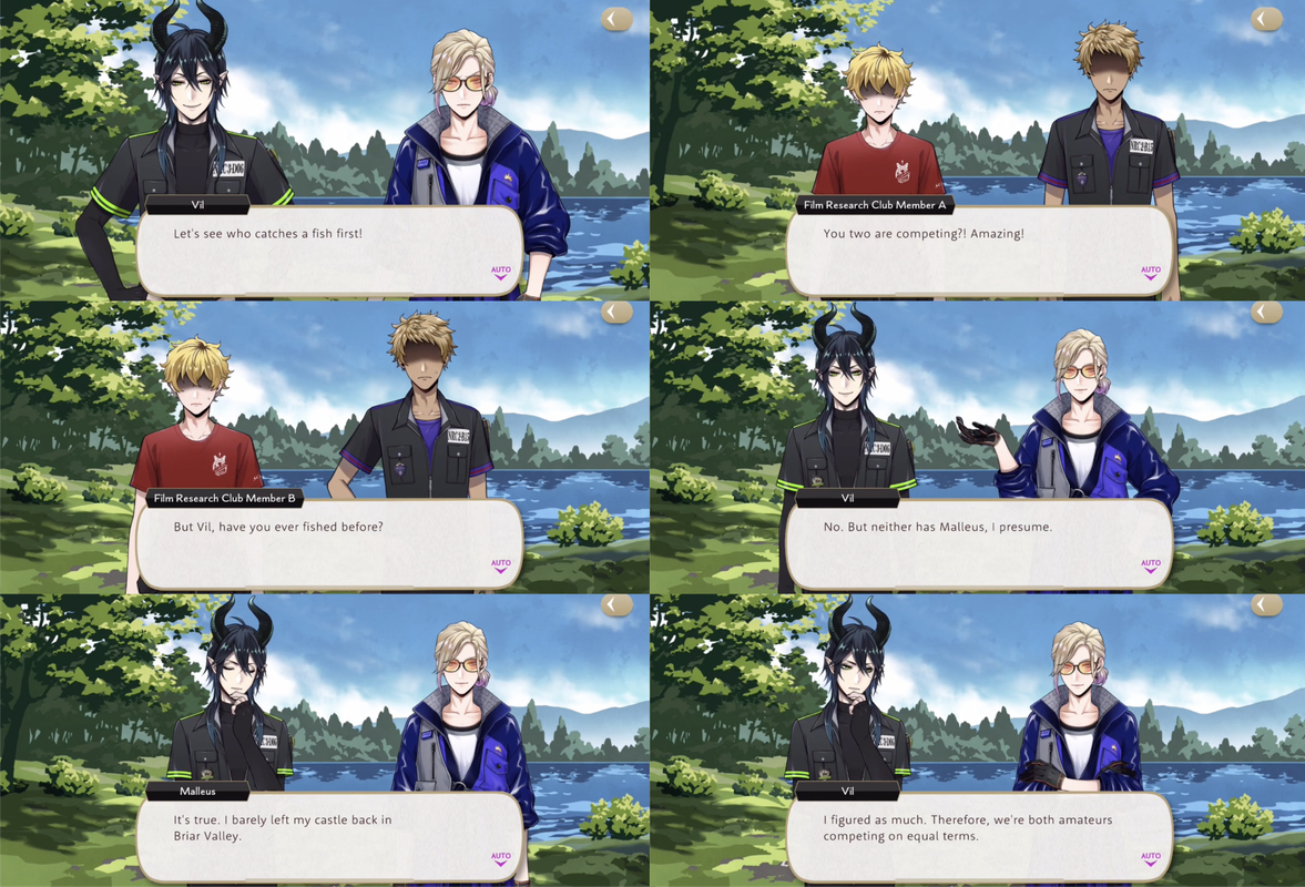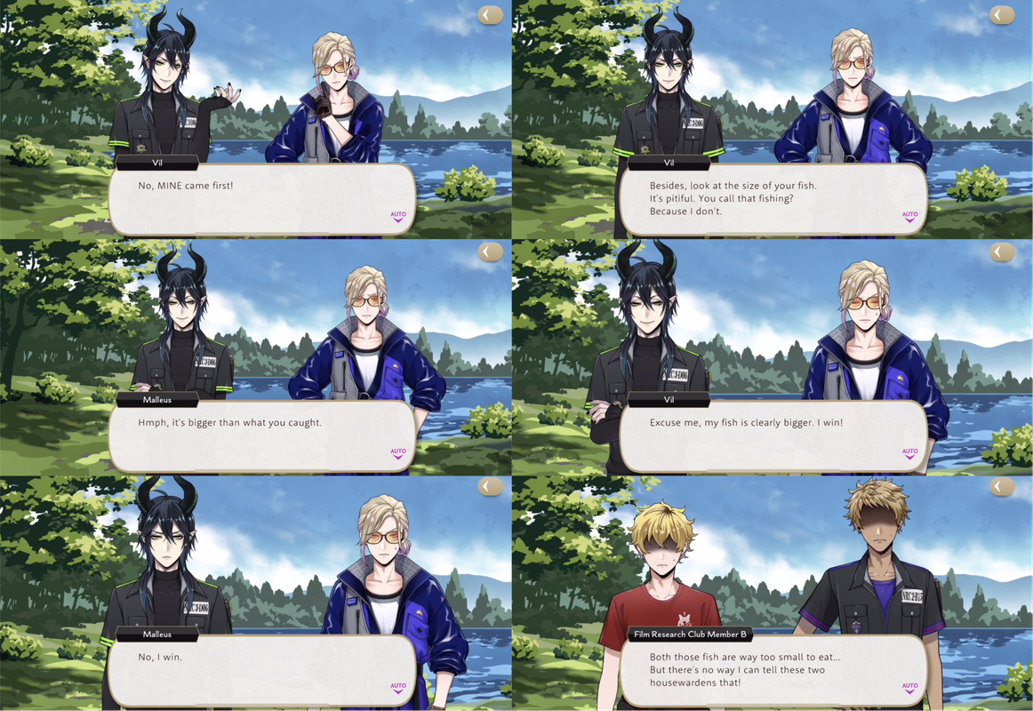 Vil catches a fish and declares his victory over Malleus (Club member: “I thought this was a battle against the fish, not Malleus”), but Malleus has also caught one, leaving the two to bicker over whose was first, with Vil insulting the size of Malleus’ fish and the Film Club members observing, “Both those fish are way too small to eat…but there’s no way I can tell these two housewardens that!”