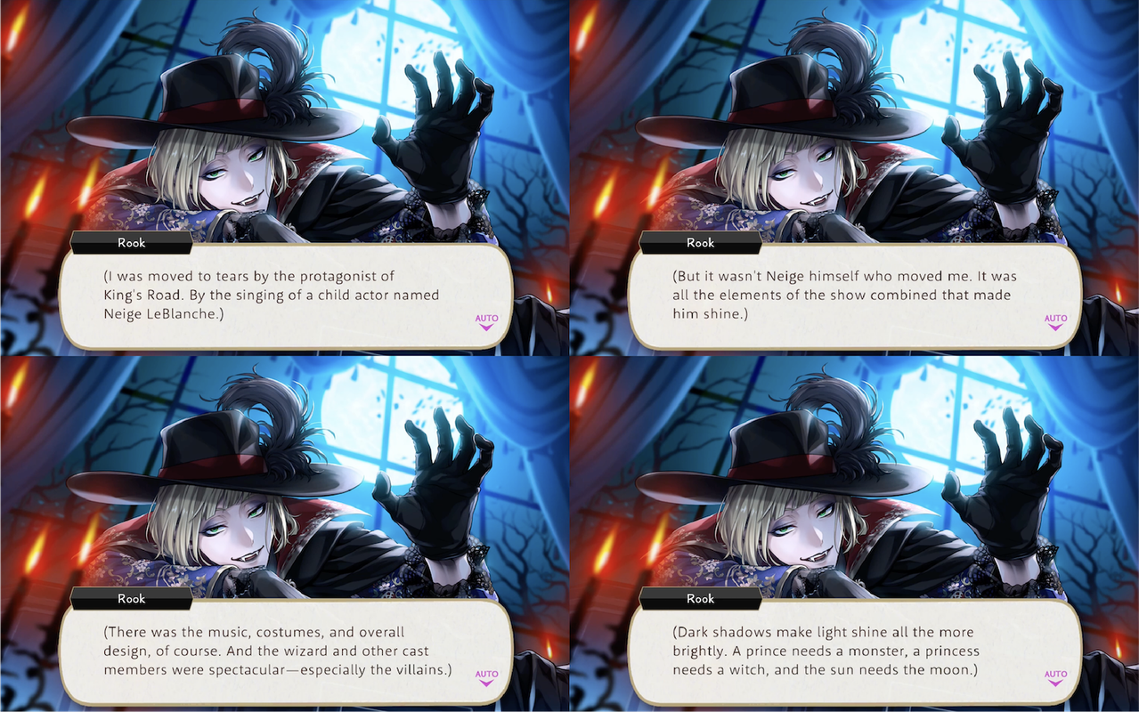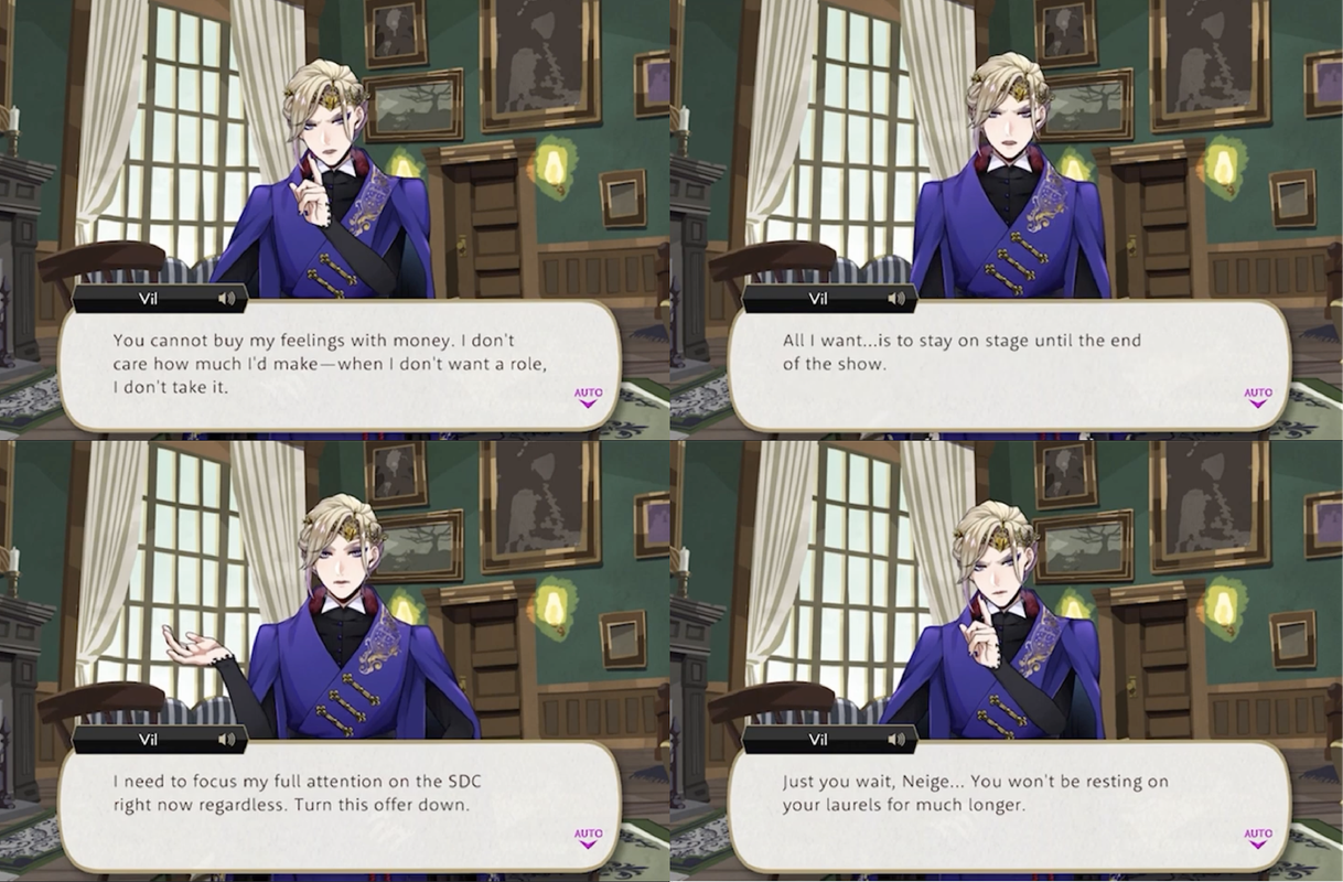 It is revealed that the hero of the story is to be played by Neige and Vil refuses outright, saying, “You cannot buy my feelings with money…all I want…is to stay on stage until the end of the show”.