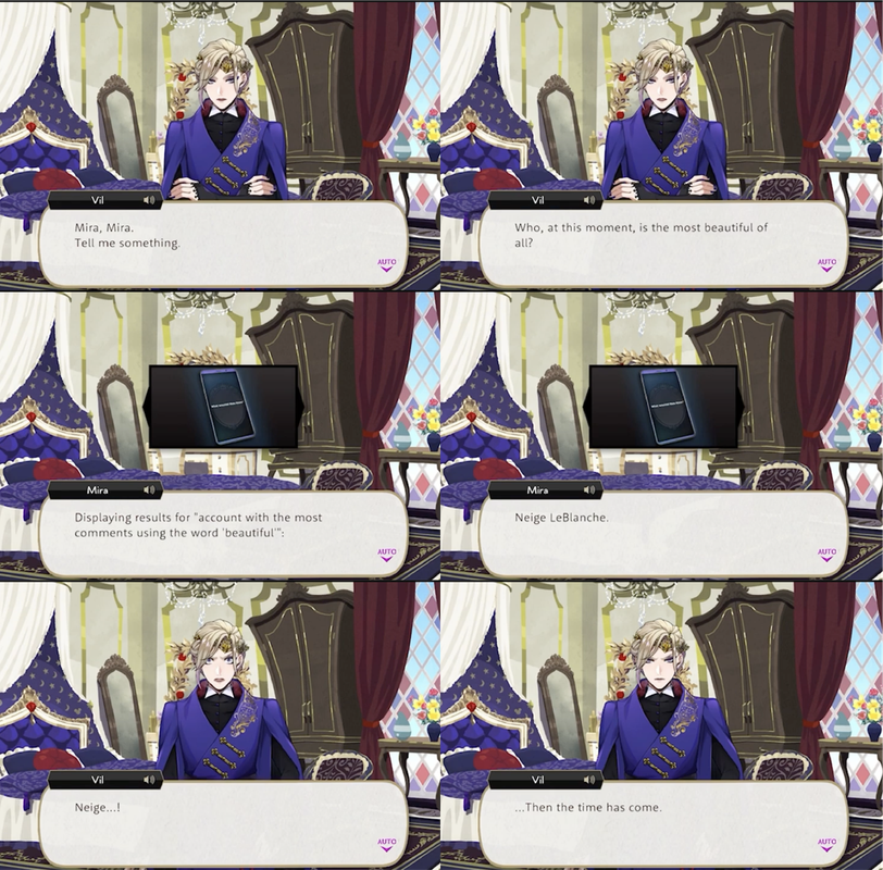 We first hear of Neige when Vil does a search for “Who, at this moment, is the most beautiful of all?”, which results in “Neige LeBlanche”.