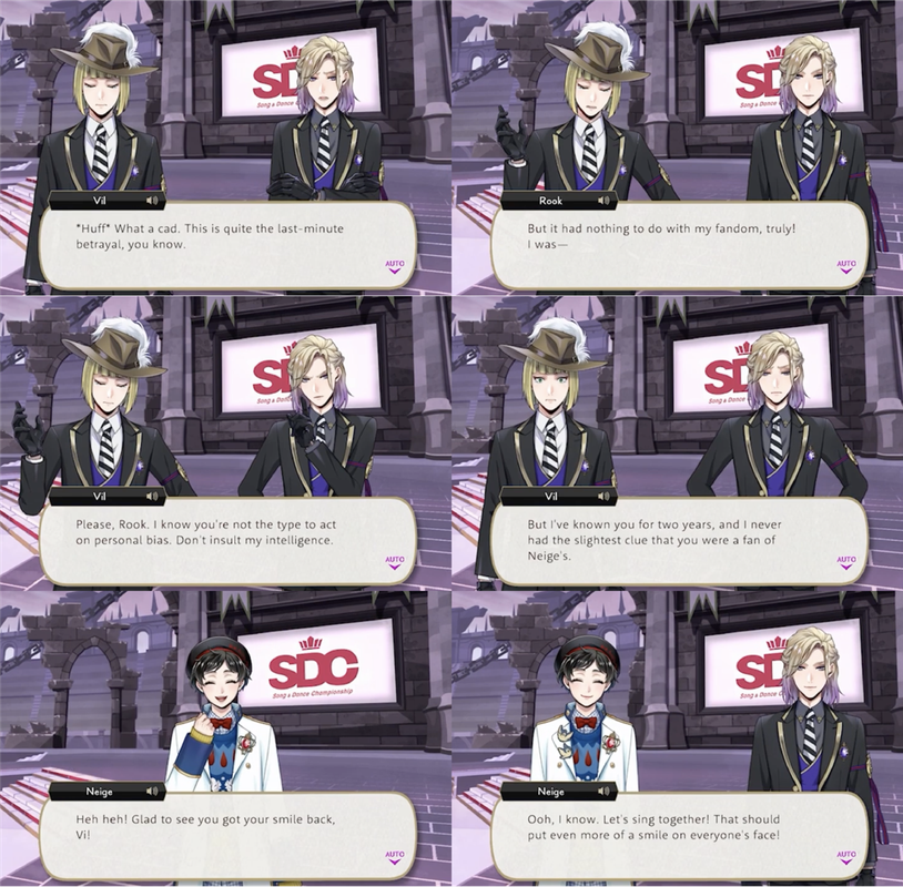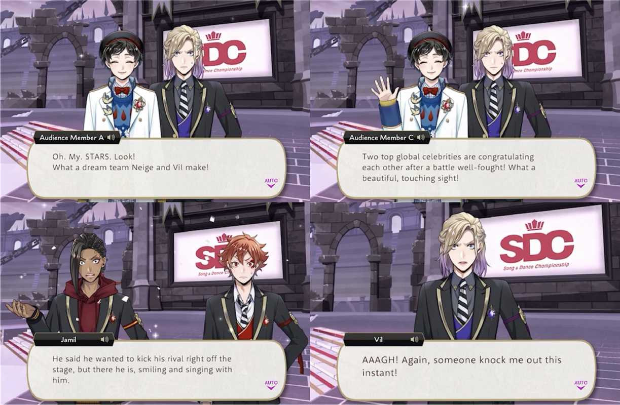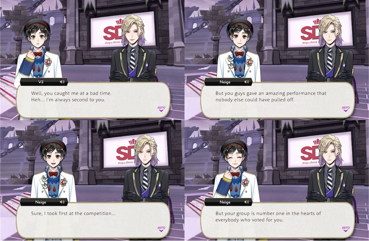 After the NRC team loses to Neige, Vil says, “I’m always second to you”, but Neige assures him, “Maybe that’s what the numbers said. But you guys gave an amazing performance that nobody else could have pulled off. Sure, I took first at the competition…but your group is number one in the hearts of everybody who voted for you.”