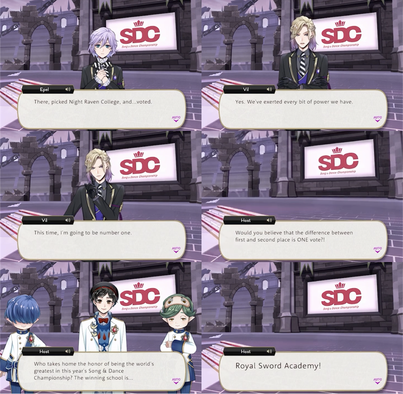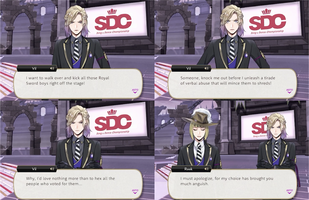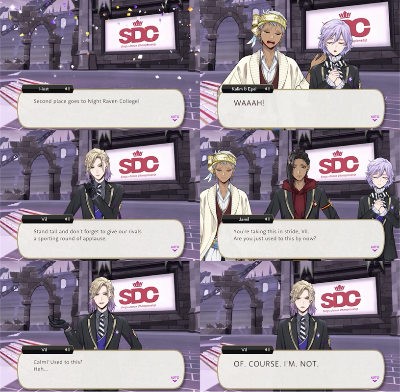 When Jamil reacts with surprises and asks Vil if he is simply used to losing to Neige by this point, he responds, “OF. COURSE. I’M. NOT,” saying how he wants to “walk over and kick all those Royal Sword boys right off the stage”, insisting, “someone knock me out before I unleash a tirade of verbal abuse that will mince them to shreds.”