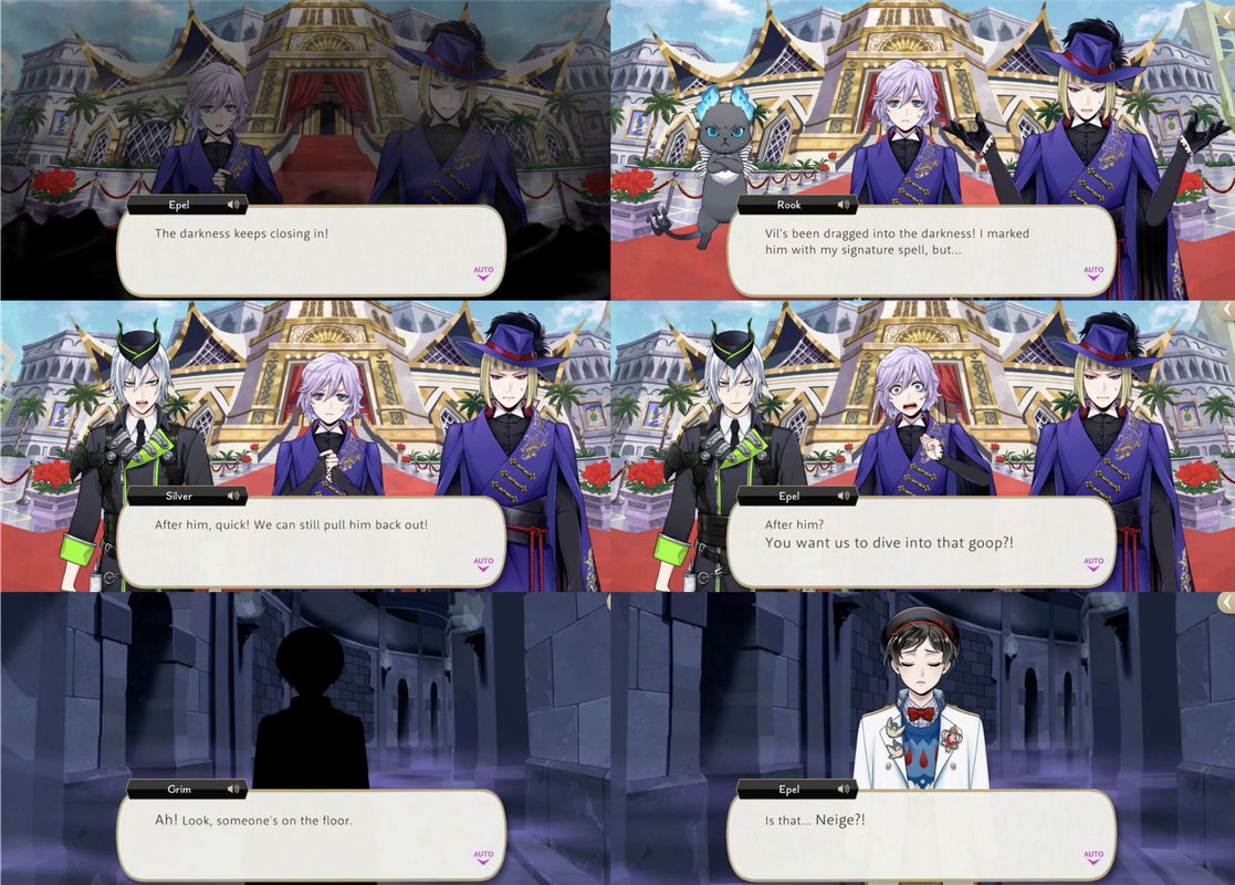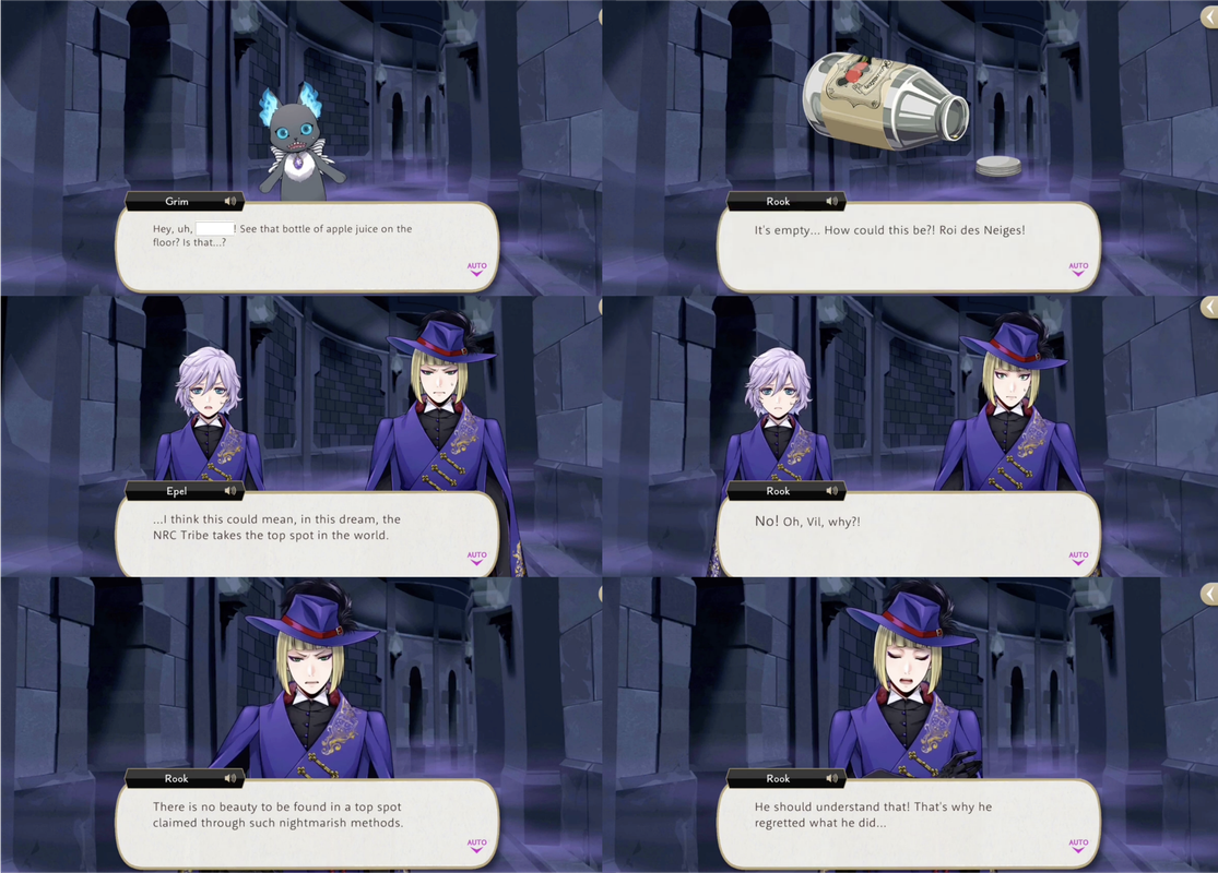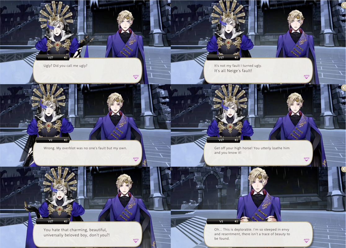 The dream is swallowed into an abyss, taking Vil with it, who discovers himself in his overblotted form blaming Neige for how his hard work is never rewarded.