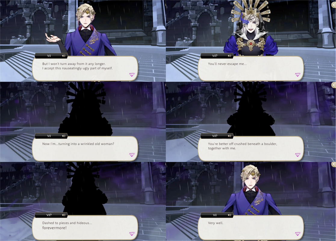 The dream-overblot turns into a wrinkled old woman who says he is better of crushed beneath a boulder, together with her. Vil responds, “Then I’ll crawl my way higher from there…together with my ugly desires!,” voluntarily adopting his overblot form and defeating himself in the abyss.