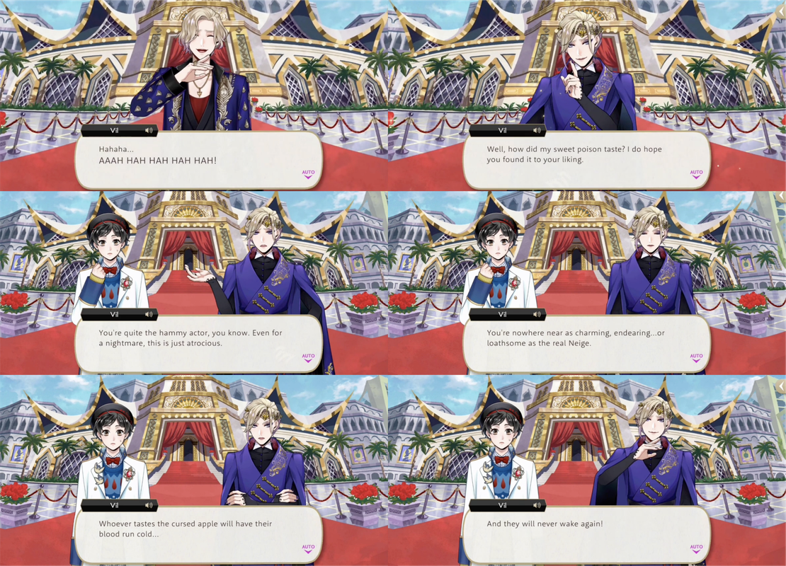 Vil’s best-actor award dream resets but now Vil is awake, telling the dream-Neige that he is “nowhere near as charming, endearing…or loathsome as the real Neige.”