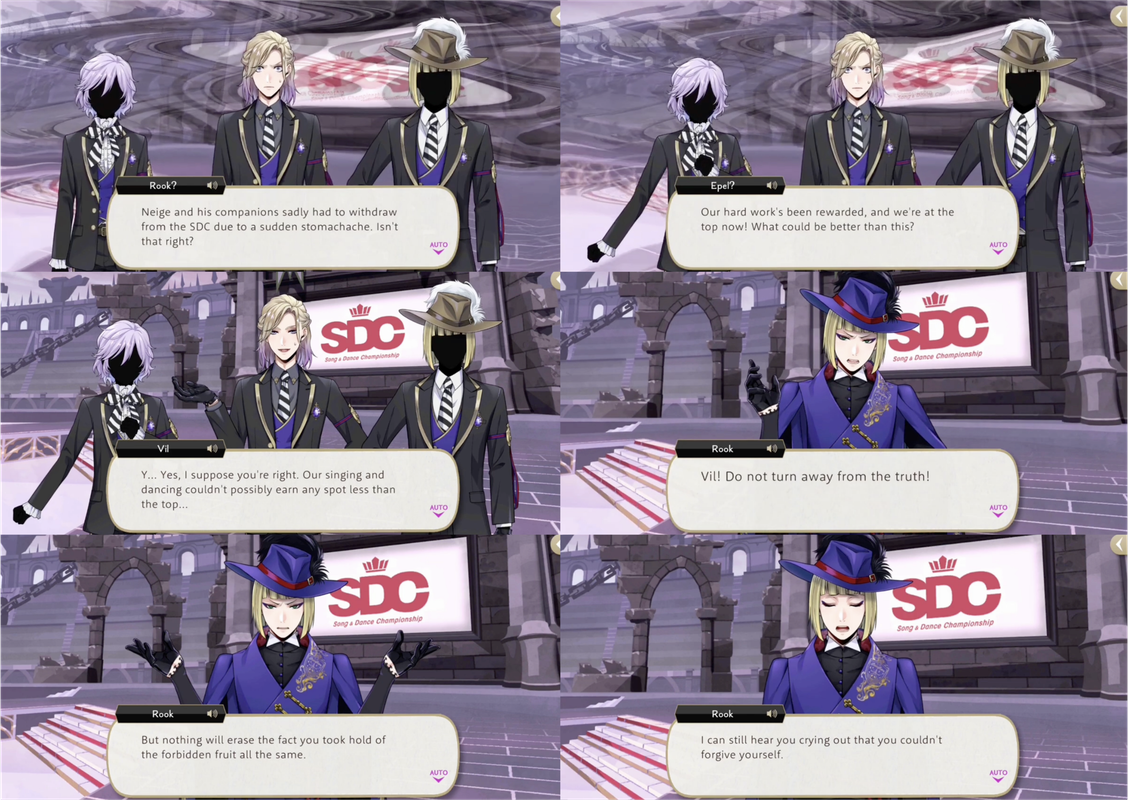 In the deeper level of the dream world the characters discover what seems to be an alternate timeline to the VDC where Vil succeeded in poisoning Neige before he had the chance to perform. Vil dreams of winning the VDC, but Epel reminds him that they actually lost to Neige.
