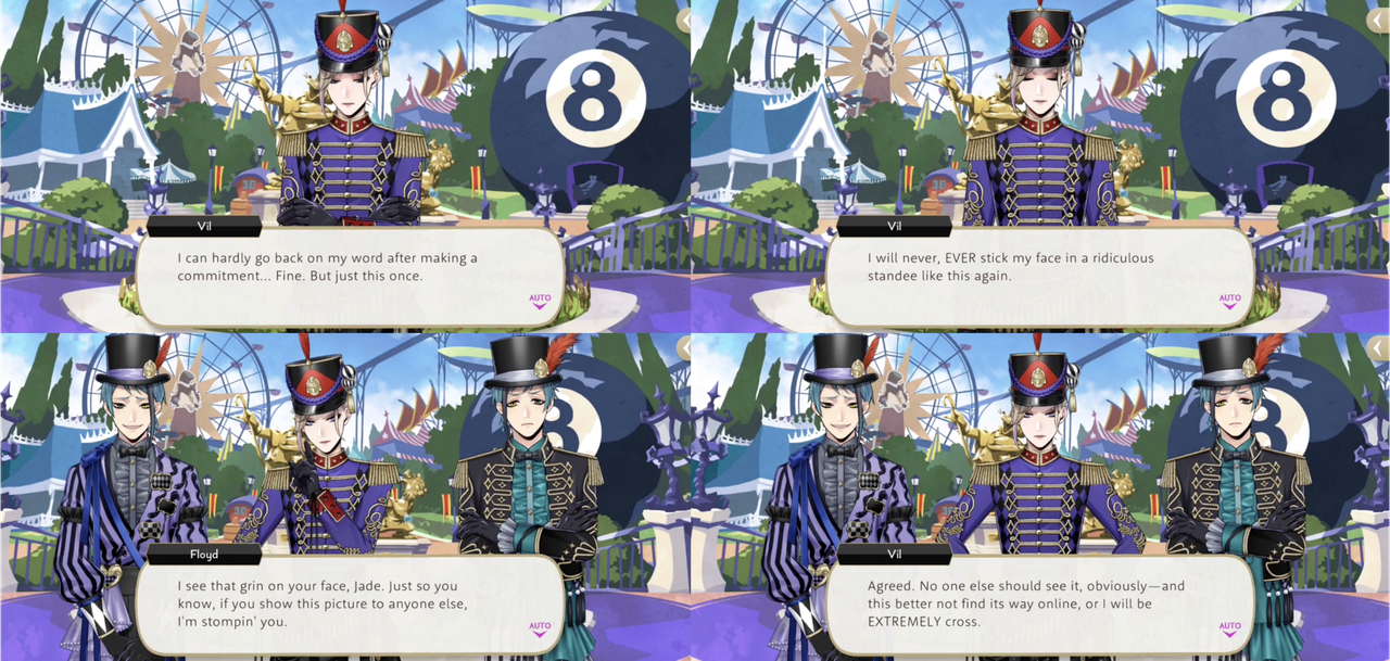 Ortho invites Vil to Playfulland after Idia refuses. Vil joins Ortho’s group at the park and defers to where he wants to go. Vil encourages Ortho’s idea to introduce a “little friendly competition” into the day, saying “It’s always more interesting with stakes involved,” and Ortho later beats him at pool.