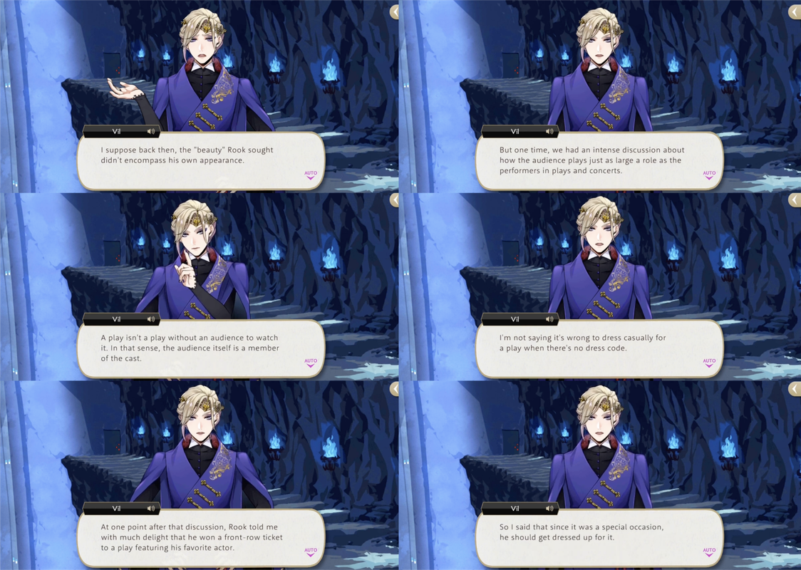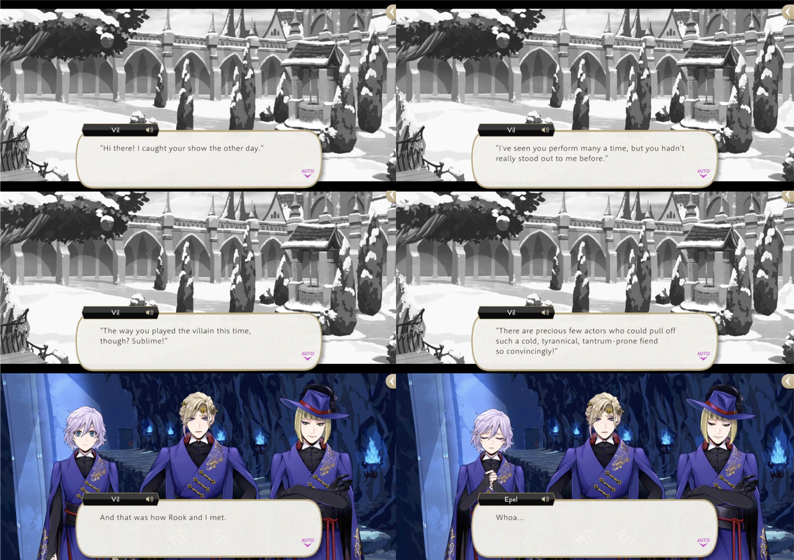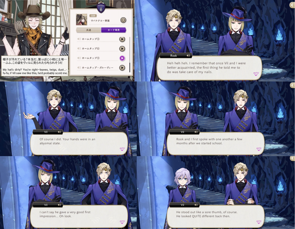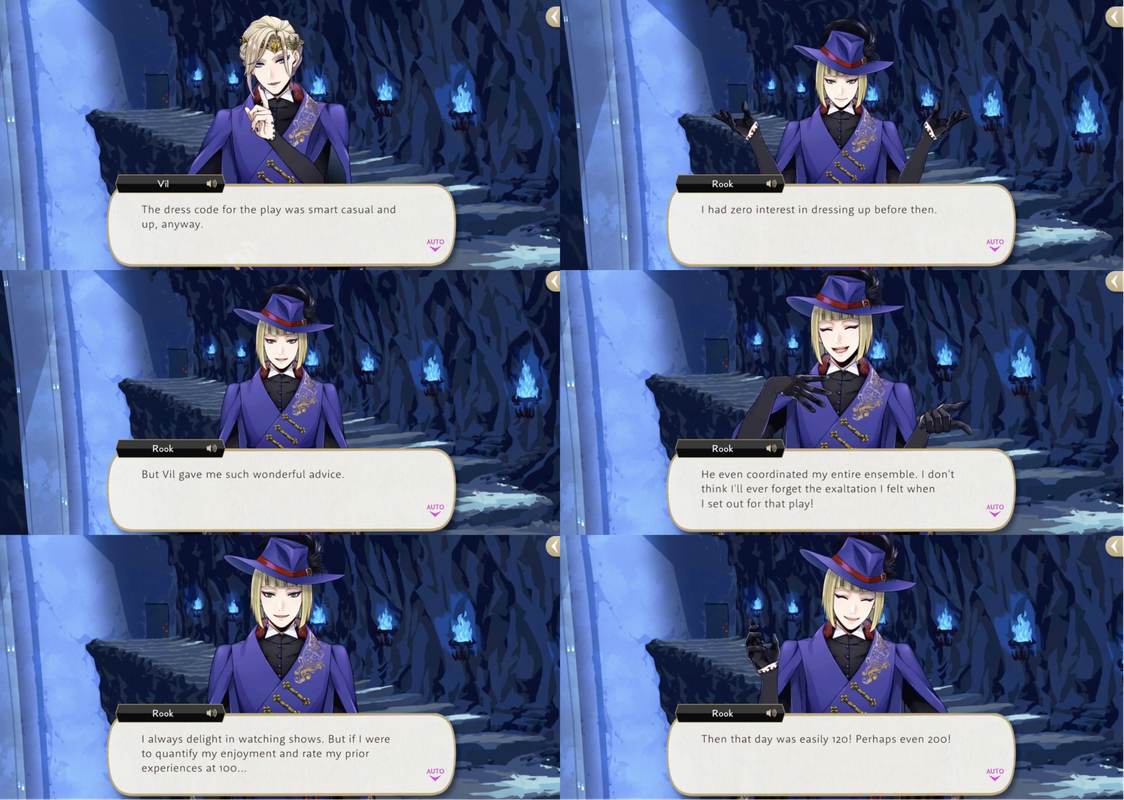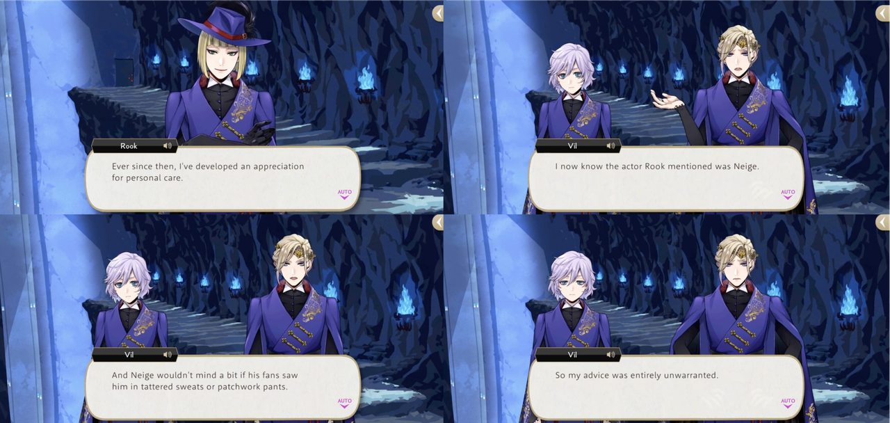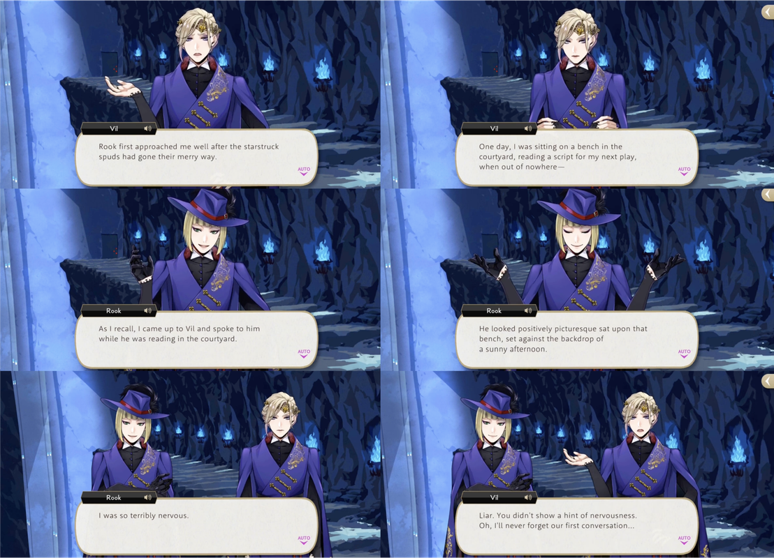 Vil says that the first time Rook approached him was when he was sitting on a bench I the courtyard, reading a script for his next play. Rook says he was “terribly nervous” but Vil calls him a liar, saying that he will never forget their first conversation, where Rook comments on how convincingly Vil played a “cold, tyrannical, tantrum-prone fiend.” Rook says he meant it as a compliment.