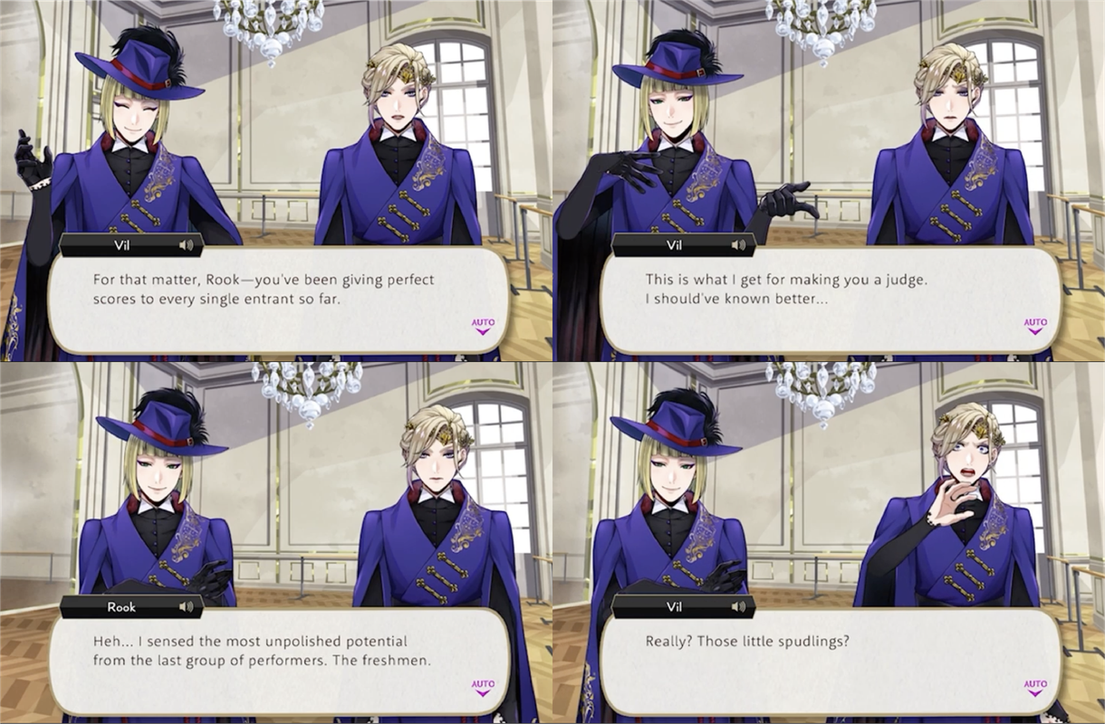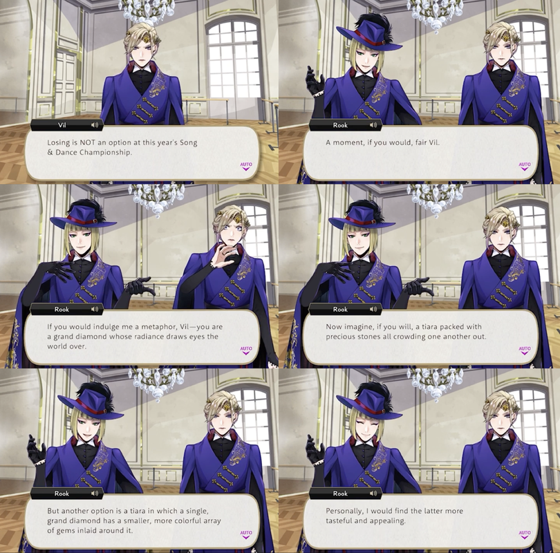 It is Rook who encourages Vil to accept Ace and Deuce into the VDC team despite their faults, saying, “Imagine, if you will, a tiara packed with previous tones all crowding one another out. But another option is a tiara in which a single, grand diamond has a smaller, more colorful array of gems inlaid around it. Personally, I would find the latter more tasteful and appealing.”