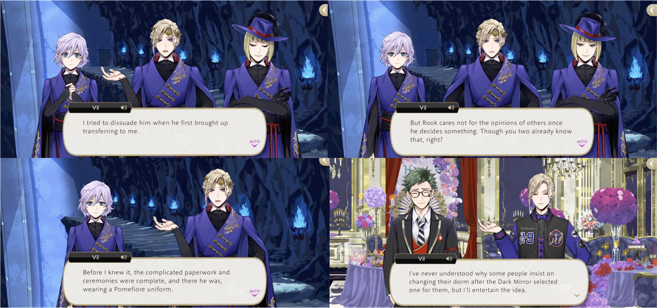 Vil says that he actually tried to dissuade Rook from transferring, but before he knew it Rook was a Pomefiore dorm member. During his second birthday interview Vil tells Trey, “I’ve never understood why some people insist on changing their dorm after the Dark Mirror selected one for them…”