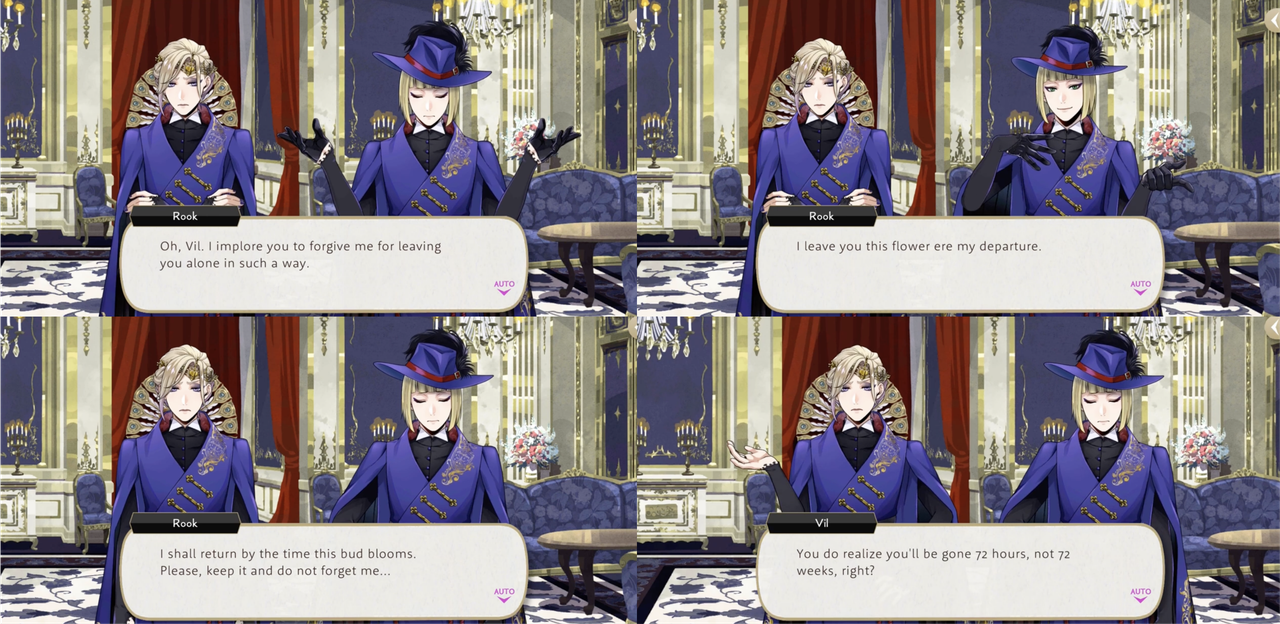 Rook says, “I implore you to forgive me for leaving you alone in such a way. I leave you this flower ere my departure. I shall return by the time this bud blooms. Please, keep it and do not forget me…” (Vil: “You do realize you’ll be gone 72 hours, not 72 weeks, right?”)