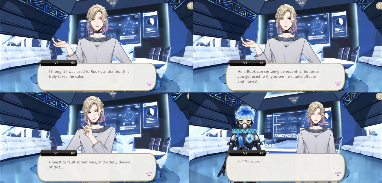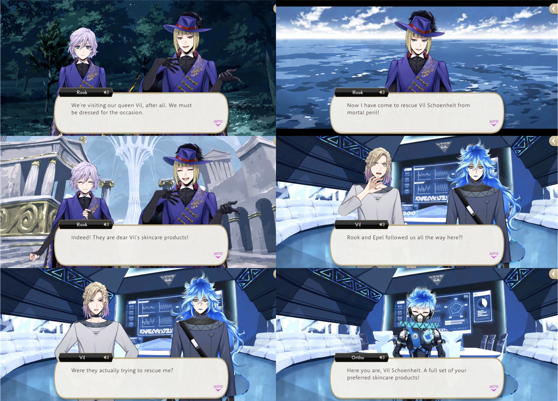 Rook successfully reaches STYX and delivers Vil’s skincare products and Vil observes, “I thought I was used to Rook’s antics, but this truly takes the cake…Rook can certainly be eccentric, but once you get used to it, you see he’s quite affable and honest. Honest to fault sometimes, and utterly devoid of tact…”