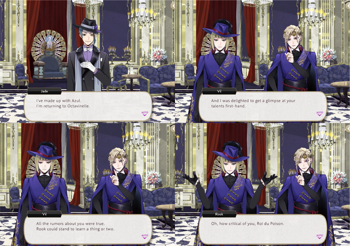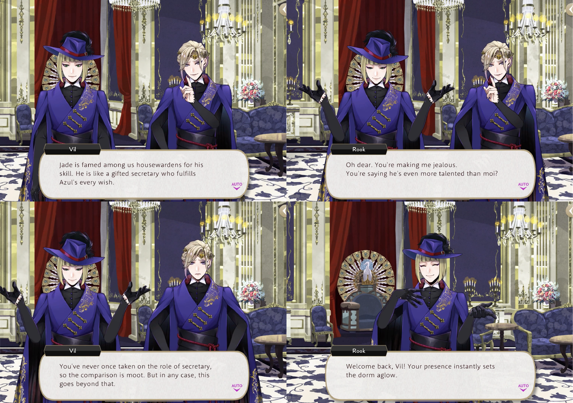 Rook’s ability to fulfill his duties as vice-housewarden may be questionable: When Vil describes Jade as “a gifted secretary who fulfills Azul’s every wish” Rook says he is becoming jealous, to which Vil responds, “You’ve never once taken on the role of secretary, so the comparison is moot.”