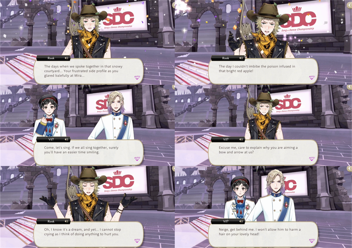 Rook then aims his bow and arrow at the dream-versions of Neige and Vil as they try to protect one another, saying, “What noble friendship you share… And yet that very harmony is proof of my terrible betrayal!”